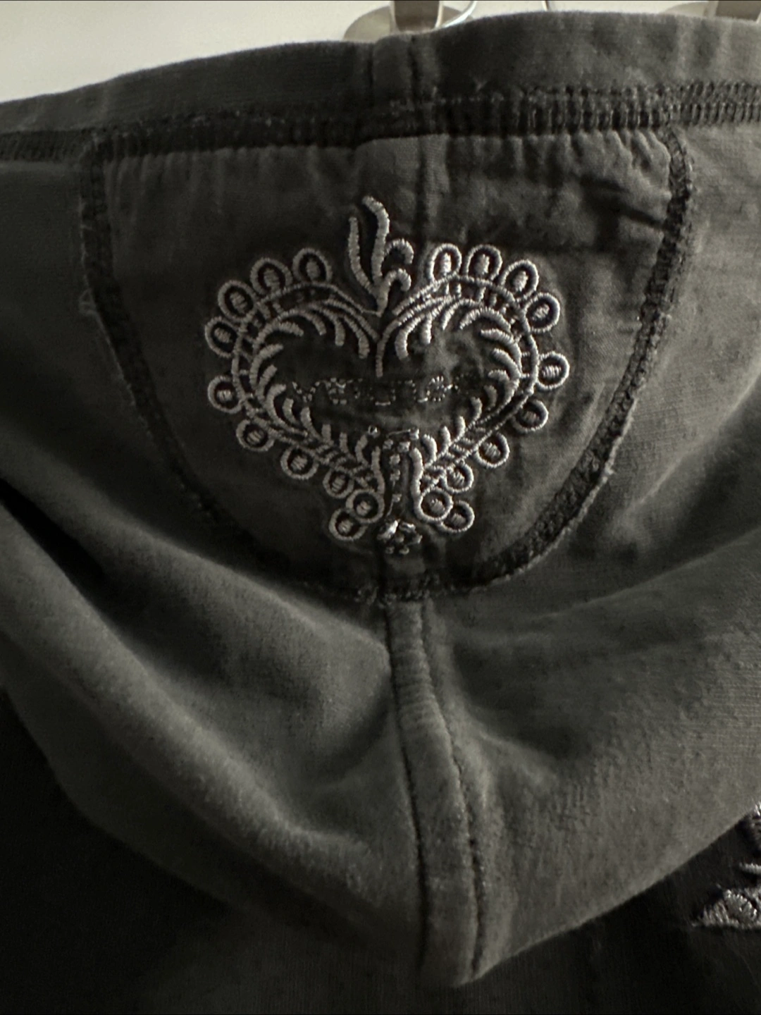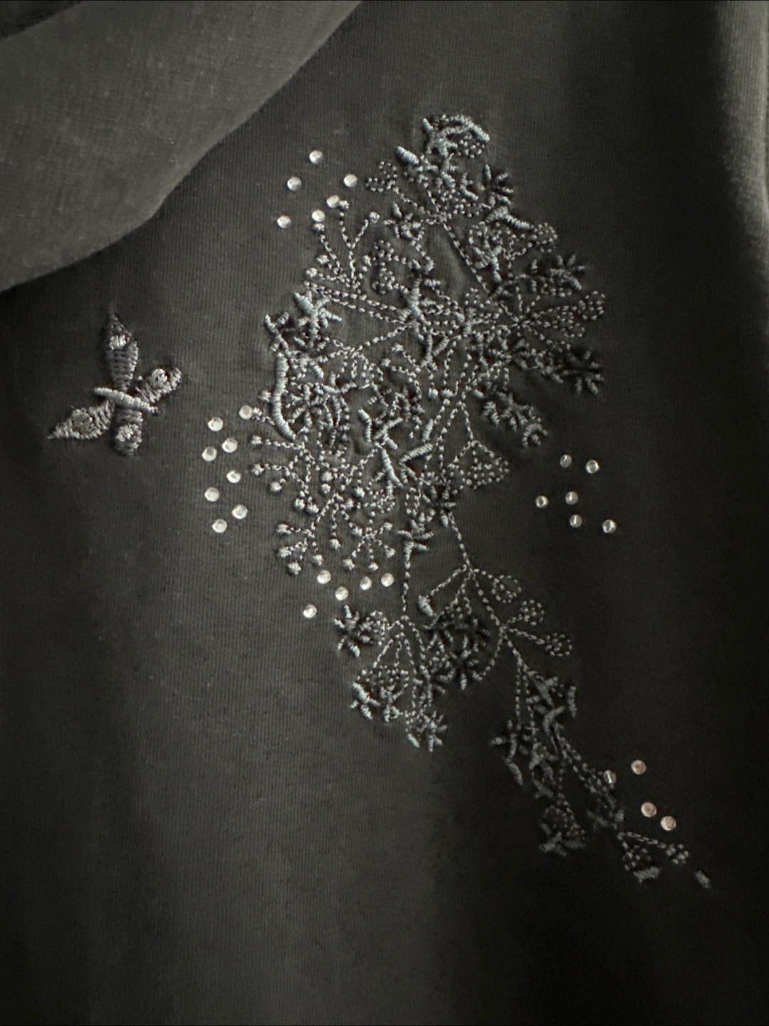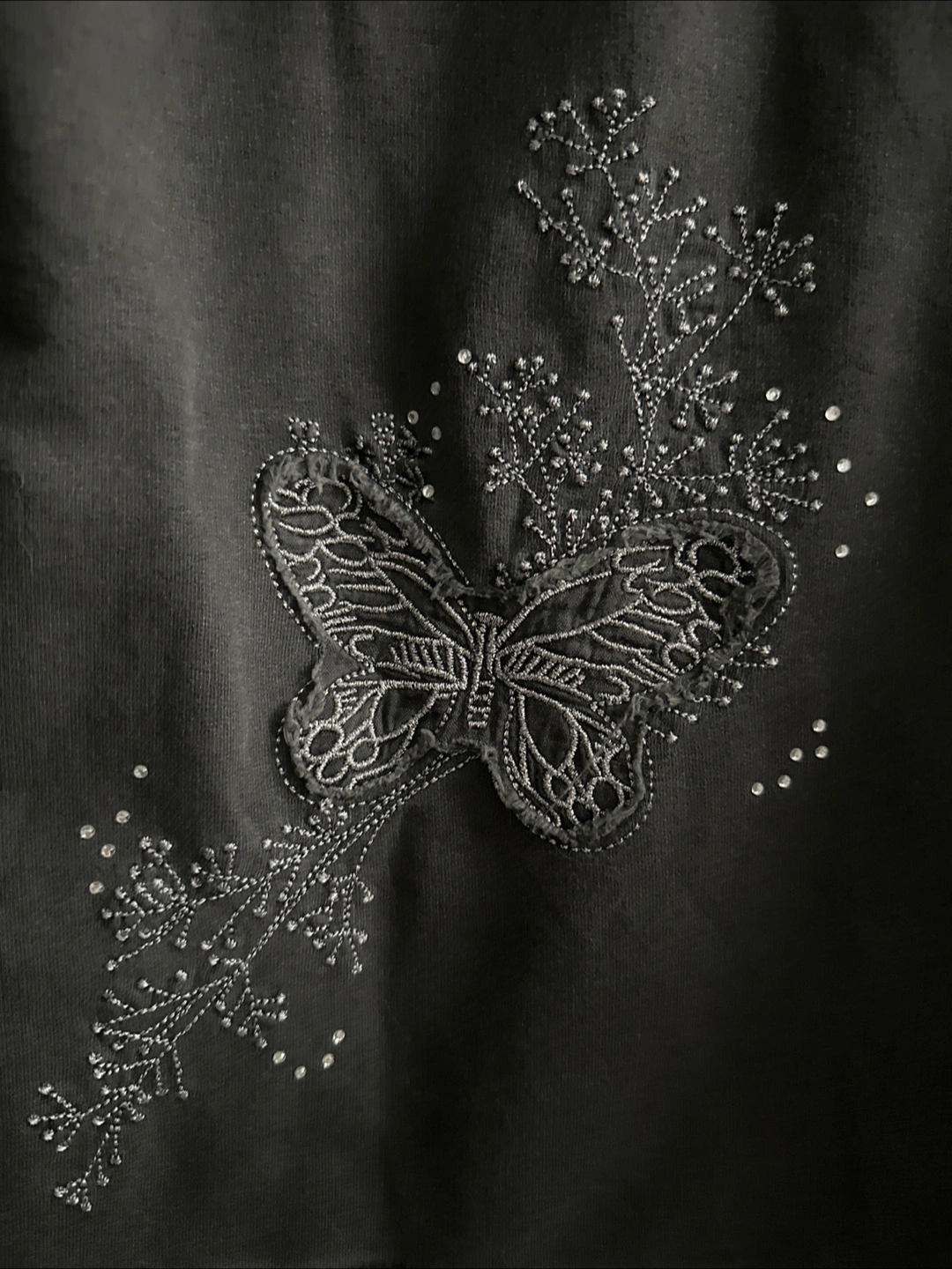 Cozy Vertigo hoodie in a dark grey colour. Features beautiful butterfly and floral embellishments with delicate beading. Perfect for adding a touch of whimsy to your casual wear