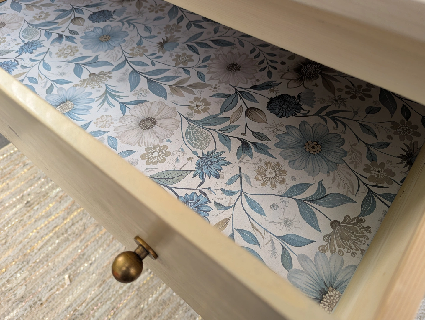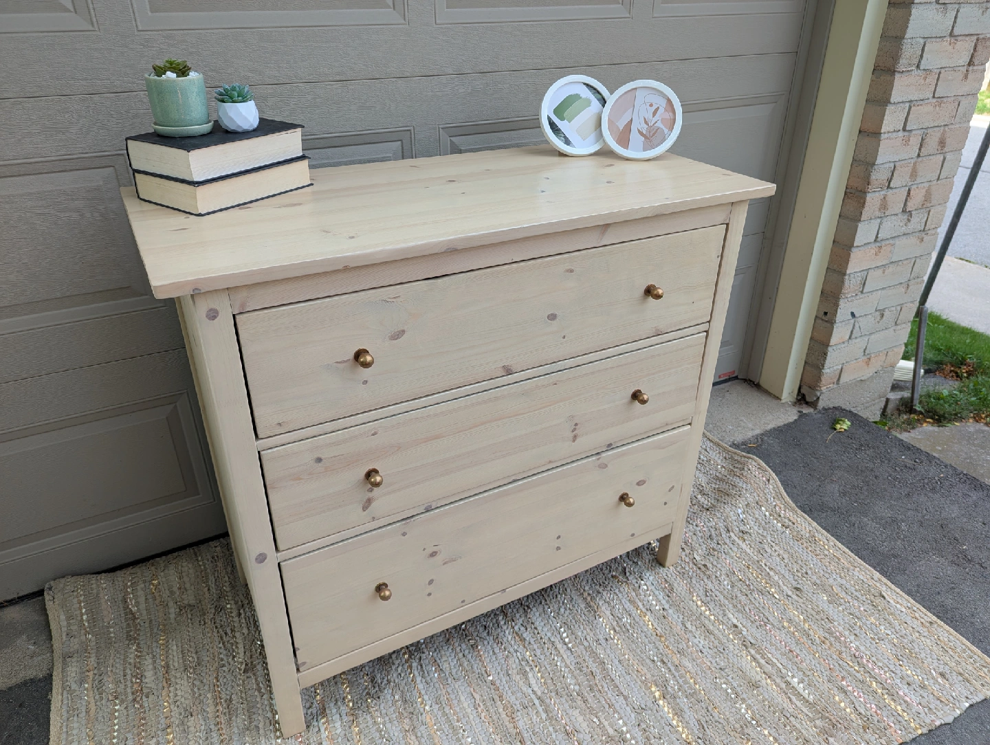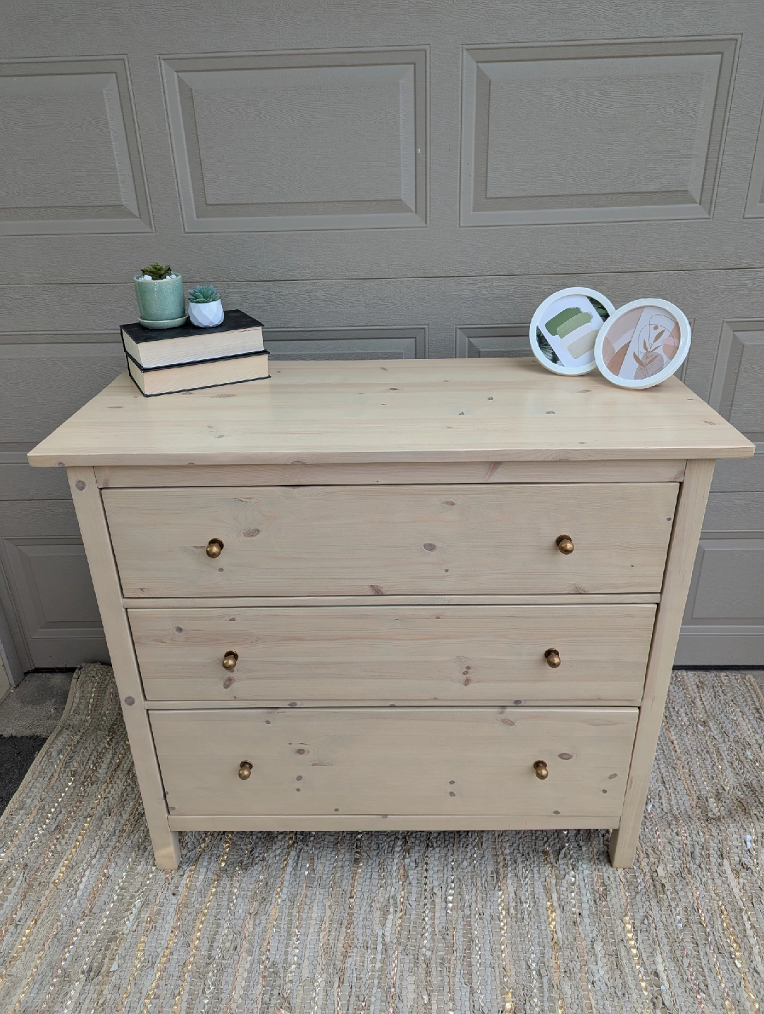 Newly refinished solid wood three drawer dresser. Stripped and given a light paint wash to accent the beauty of the wood grain.