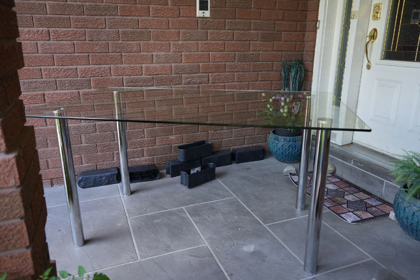 Selling a glass top table with chrome legs. It's in good condition and would be a great addition to any room! The sleek design is sure to complement your home decor