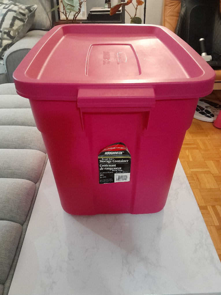 Selling a Rubbermaid Roughneck storage container in a vibrant magenta colour! This container is super durable and perfect for storing all sorts of things. It holds 68L, so it's a great size for bigger items. The dimensions are 61 x 40.6 x 42 cm (24" x 16" x 16Β½").