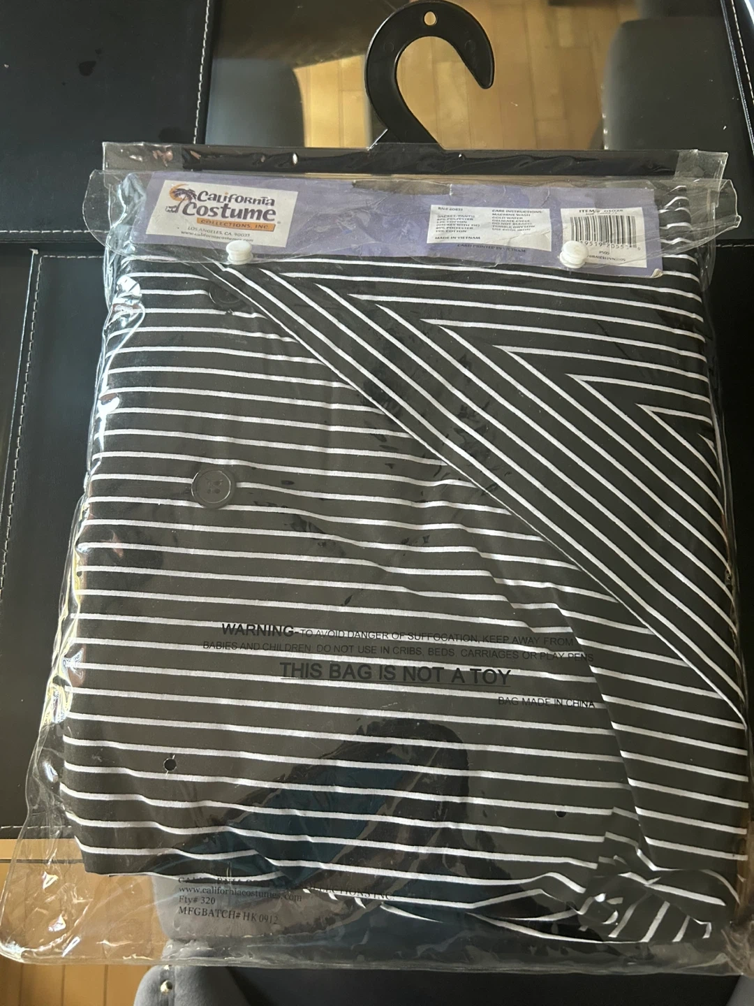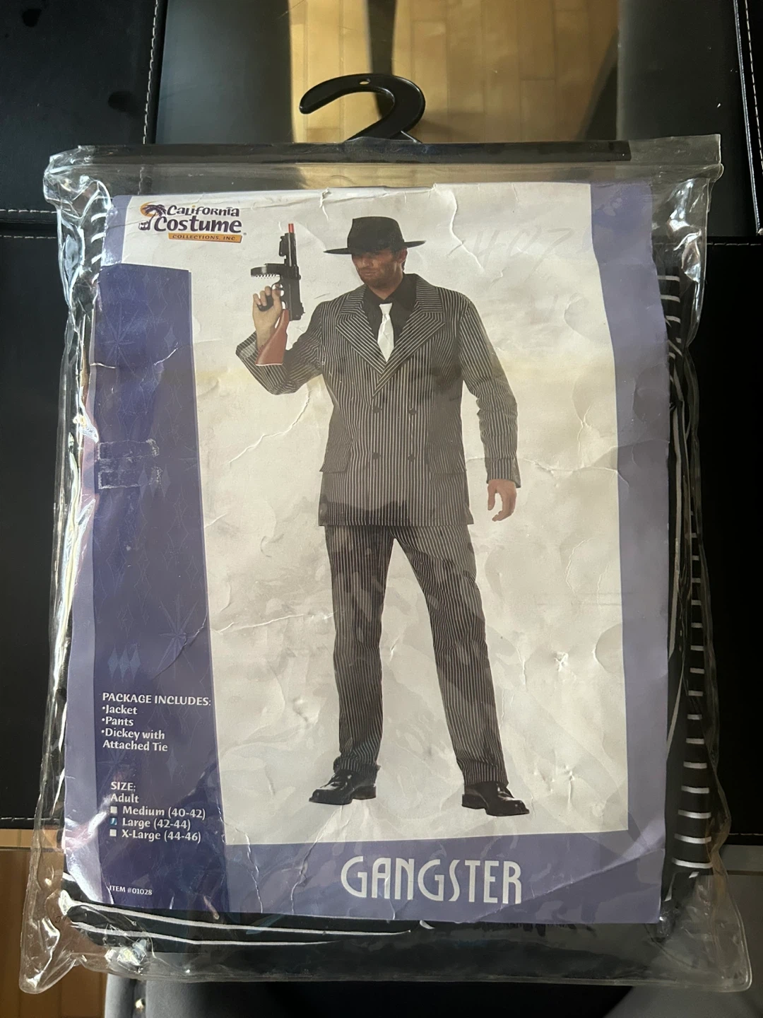 Step back in time with this brand new California Costume gangster suit, perfect for costume parties or themed events! This striking pinstripe suit includes a jacket, pants, and a mock dickey with an attached tie, ensuring you're ready to hit the scene with classic mobster style. Never worn and still in its original packaging, this set will have you looking sharp and ready to impress.