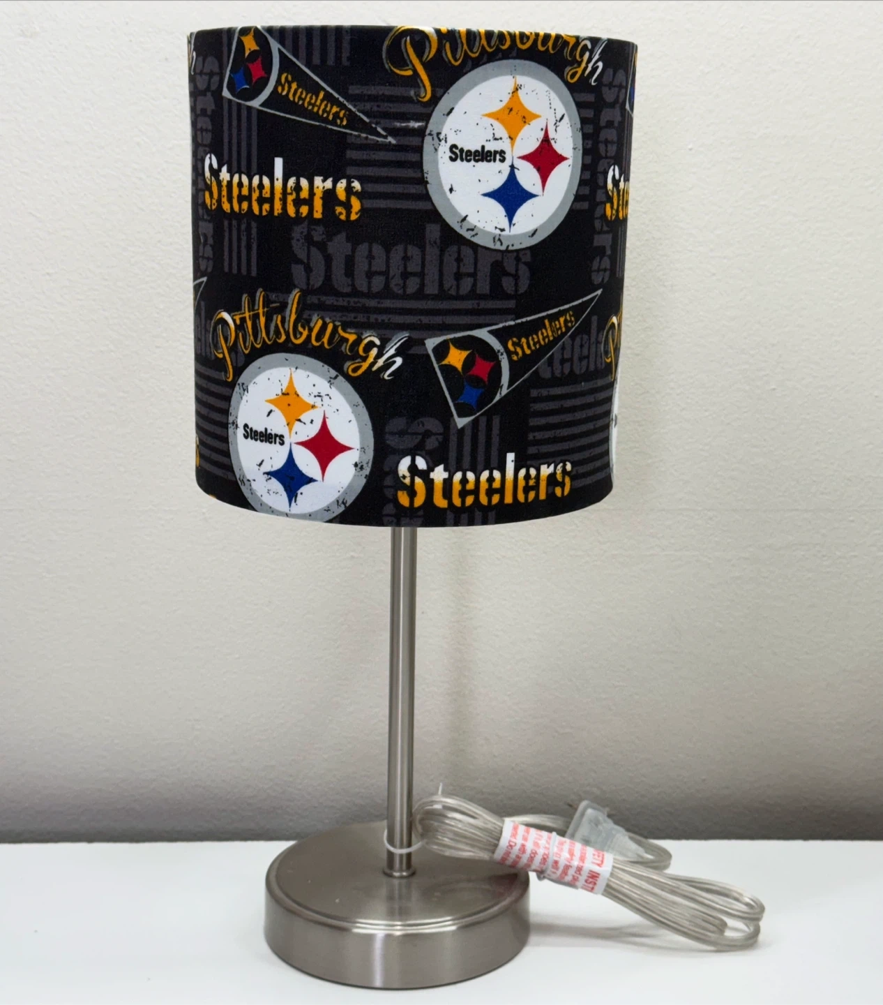 Selling a table lamp with a Pittsburgh Steelers themed lampshade. It features the Steelers logo and team name in black and gold. The lamp has a silver-tone base and comes with a power cord. Perfect for any Steelers fan!