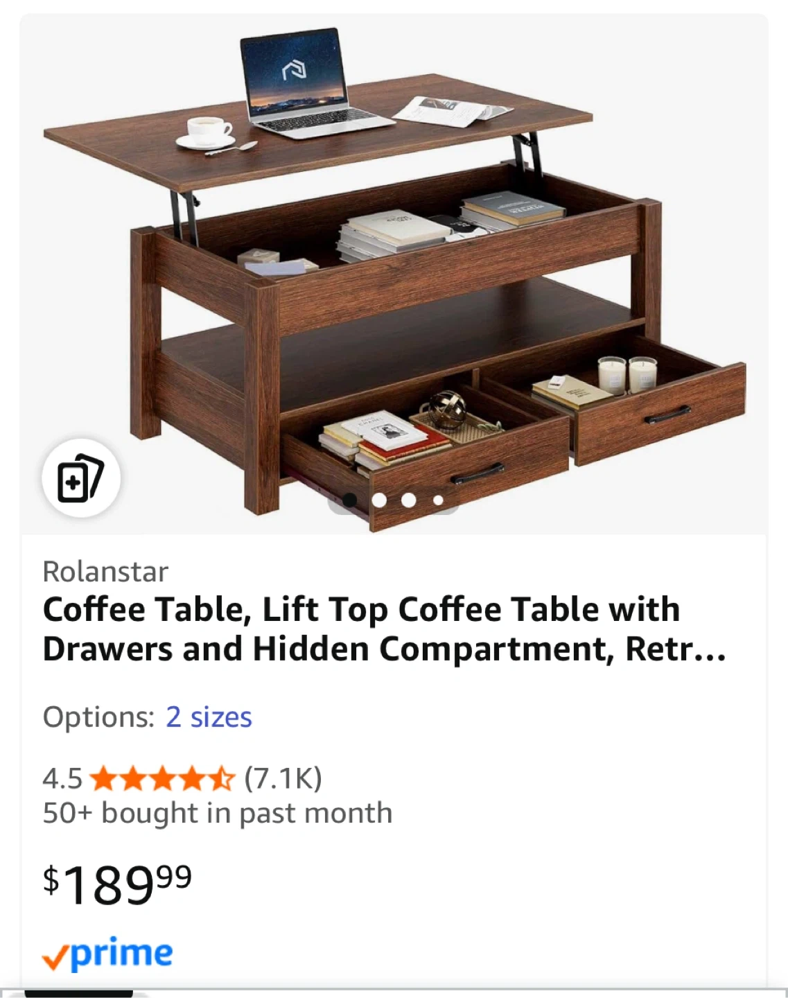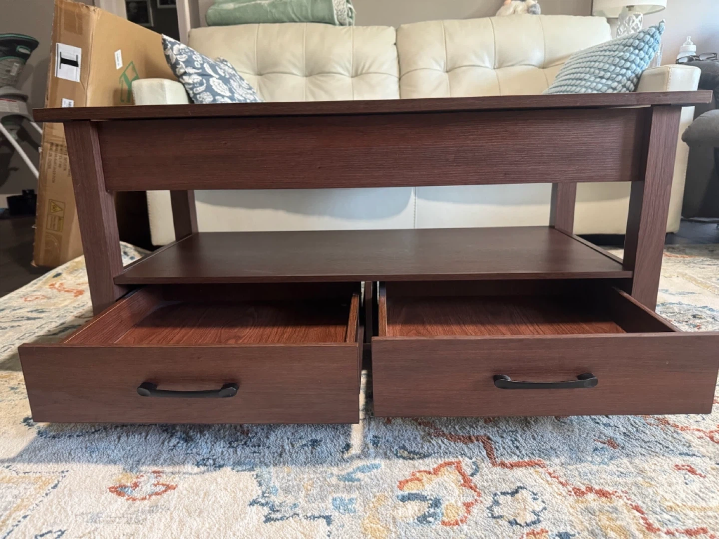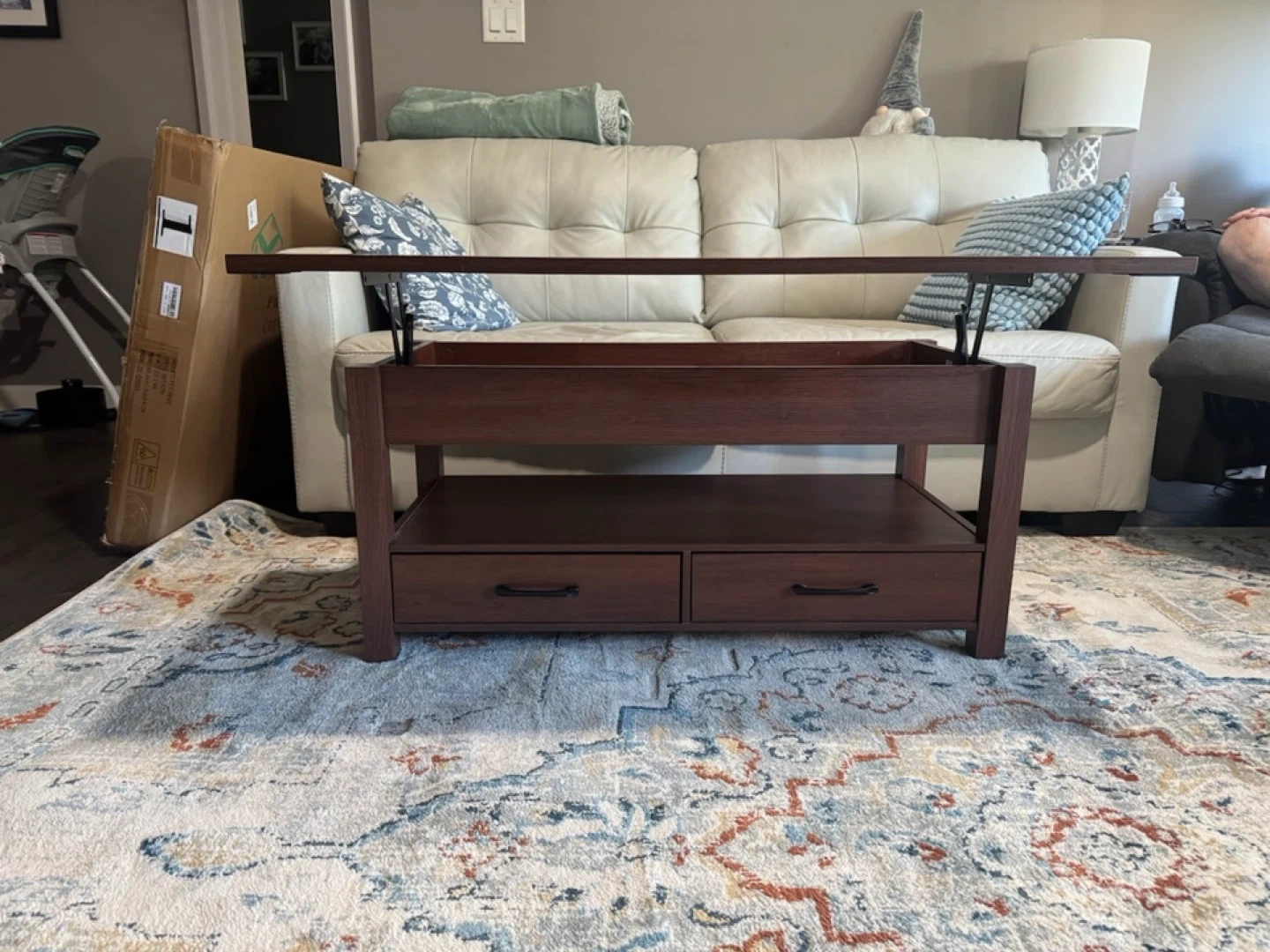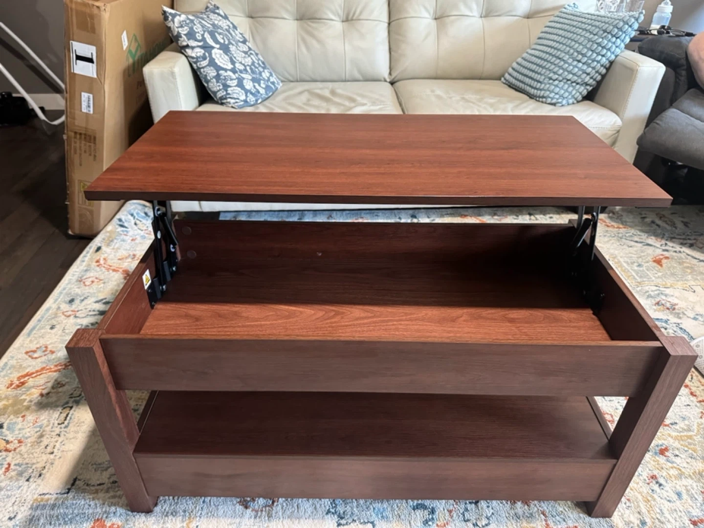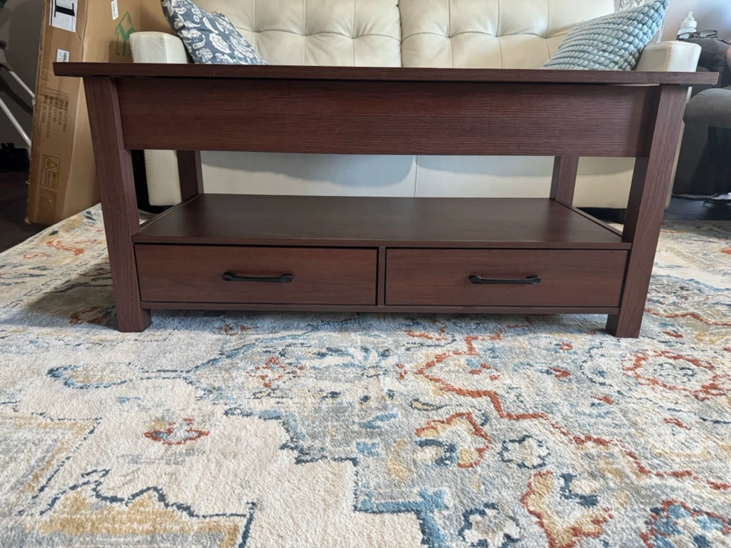 Selling a lift-top coffee table in a lovely brown wood finish! It's in great shape and ready to add some functionality to your living room. The lift-top feature makes it perfect for working from home or enjoying a meal while watching TV. Plus, it has drawers for extra storage to keep your space tidy. Bought from Amazon, owned for less than a year, no marks or scratches.