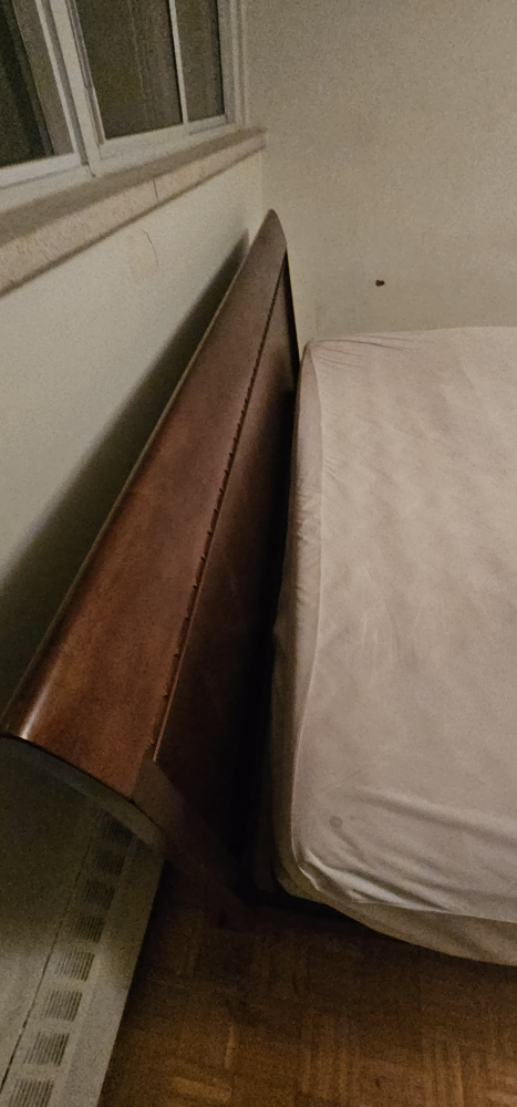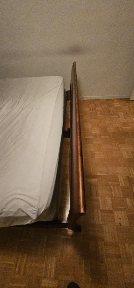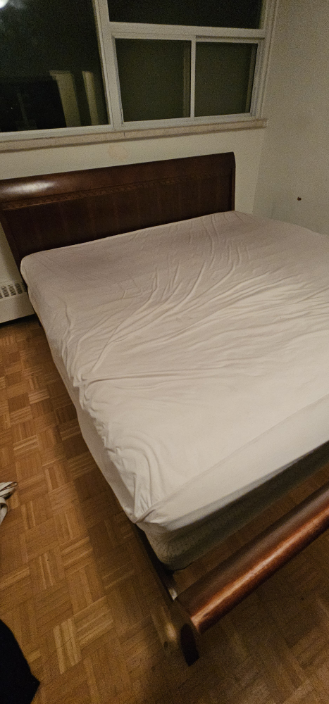 Selling a king size bed frame and mattress. The bed frame is a dark brown wood. Mattress included or not