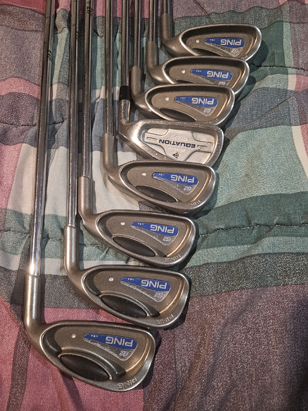 Selling a set of Ping G2 golf clubs. The set includes irons 3 through 9 and a wedge. They are in good condition and ready for the course!