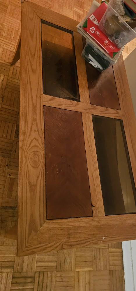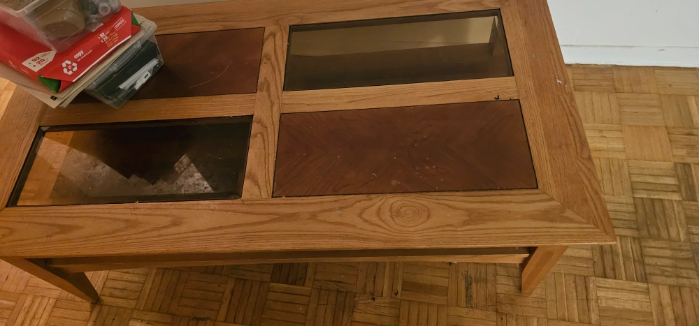 Selling a wood coffee table. It has glass inserts on the top. Great for any living room! one of the mirrors is scraped from one end but not noticeable
