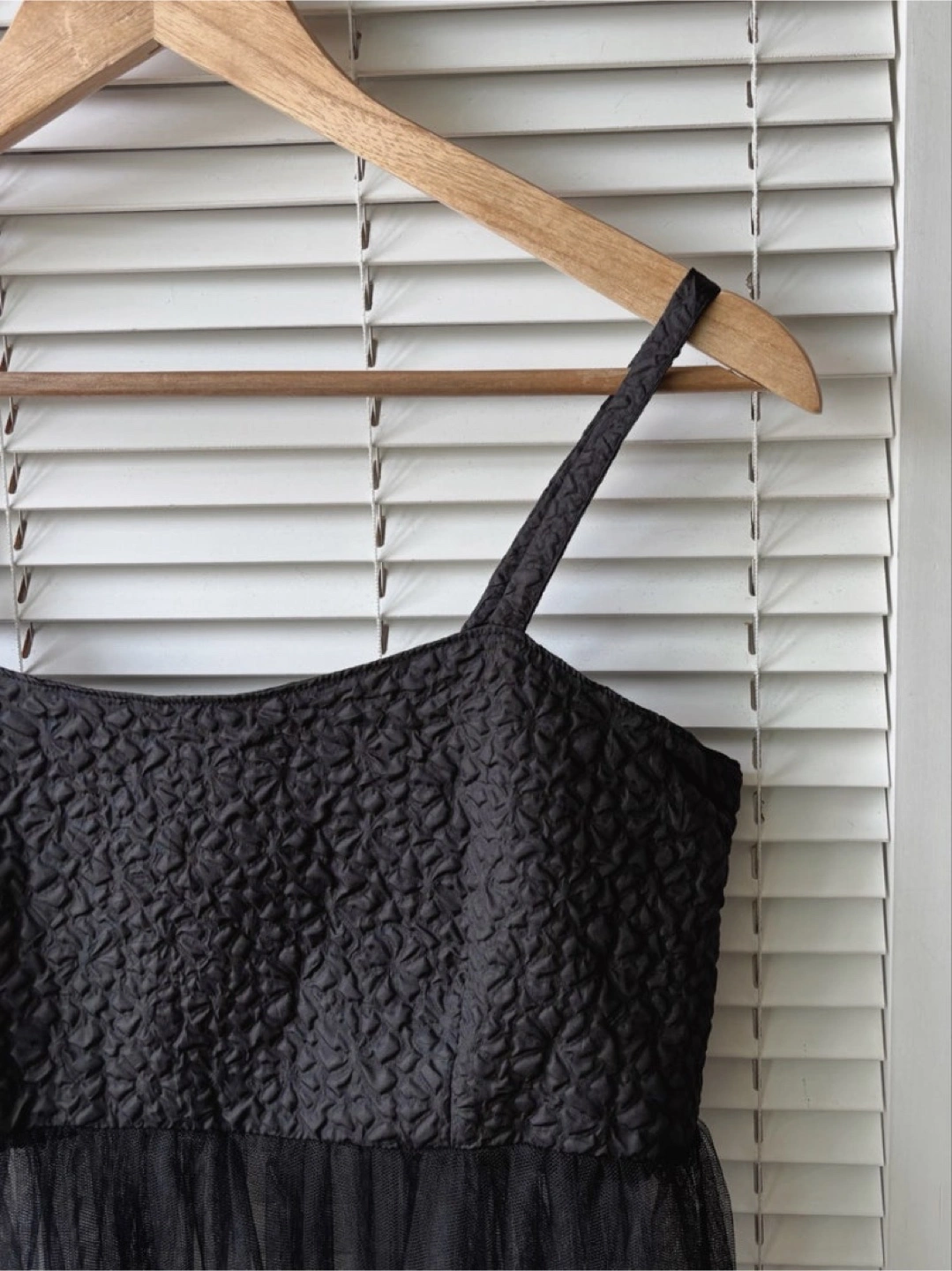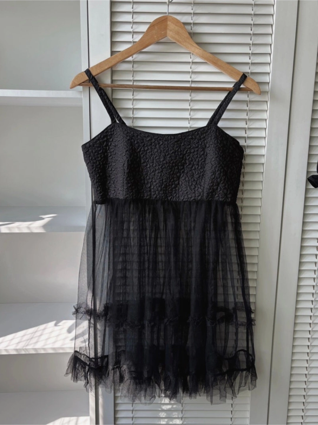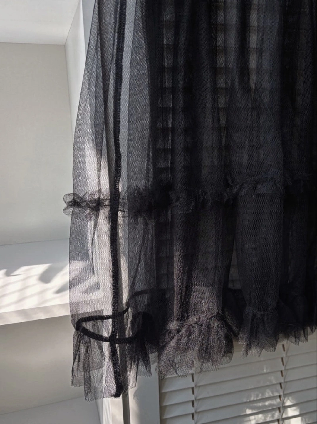A striking vintage black sheer mini dress crafted from 100% polyester with a textured bust and layered mesh skirt. Designed with adjustable straps and a flowy see-through overlay, this piece creates a dramatic silhouette perfect for cocktail parties, gothic or grunge looks, layering with Y2K street style, or as a unique festival outfit.