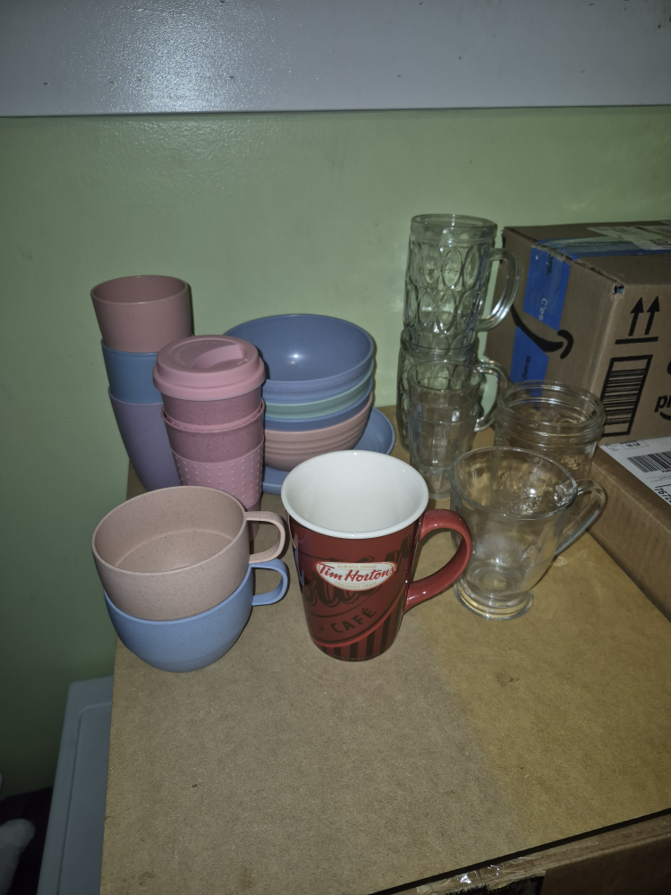 Selling a mixed lot of mugs, bowls, and glassware. Includes a Tim Hortons mug, clear glass mugs and cups. and colorful wheatstraw dishes that are unbreakable, microwave and dishwasher safe! They are a plant based material and not plastic. Two of the pink cups are "to go cups" with lids. All in good used condition!