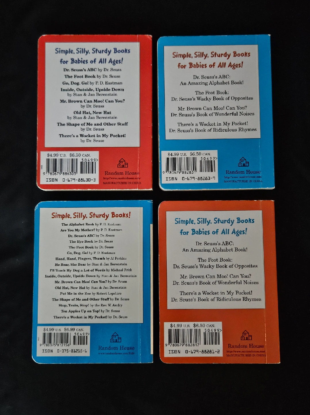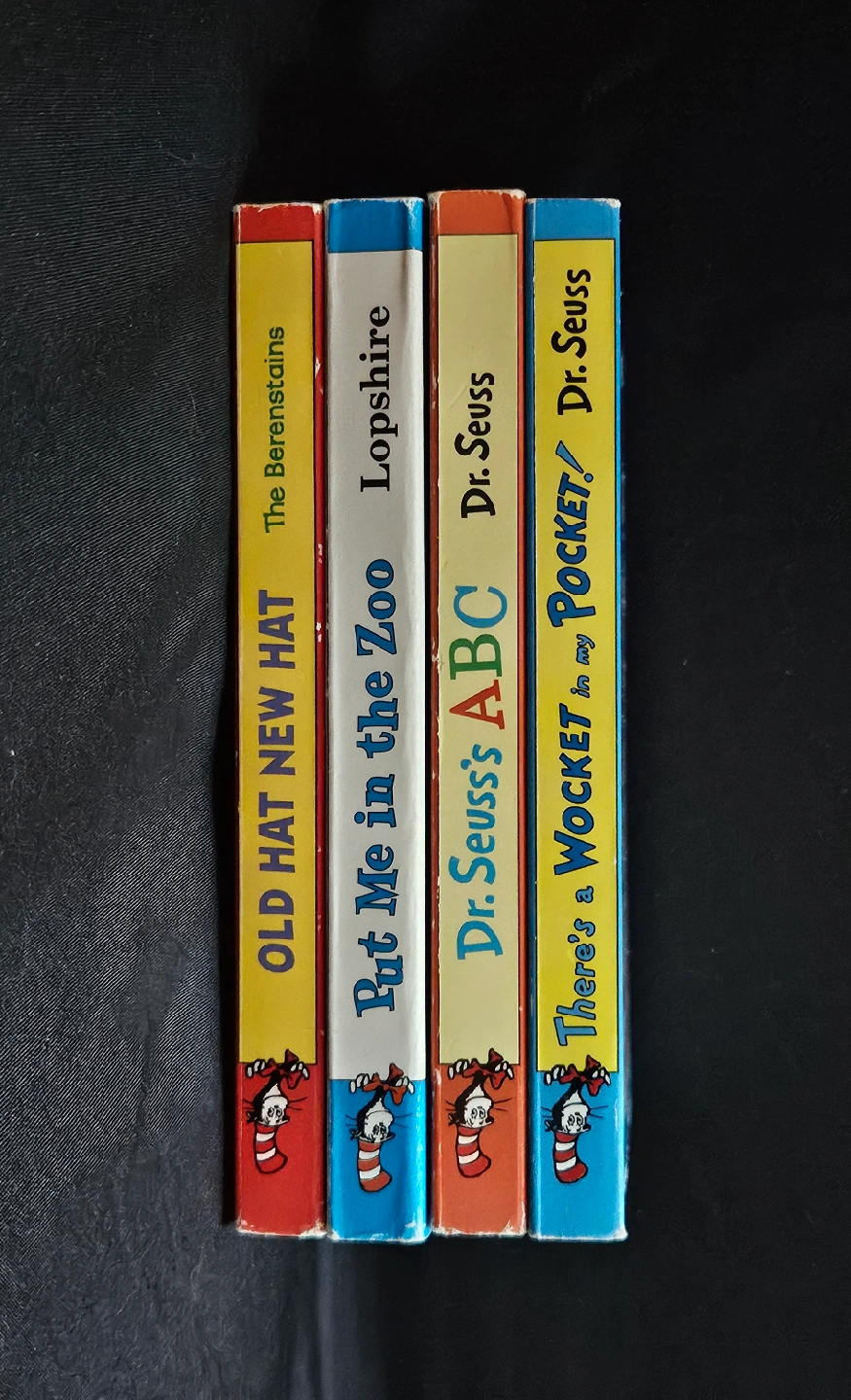 65Bright & Early Board Books for babies and toddlers. Titles Include: - ABC Alphabet Book by Dr. Seuss - There's a Wocket in my Pocket by Dr. Seuss - Put Me in the Zoo by Robert Lopshire - The Berenstain Bears Old Hat New Hat by Stan & Jan Berenstain These sturdy books are perfect for little hands and early learning. In very good used condition. $2 each or all for $6