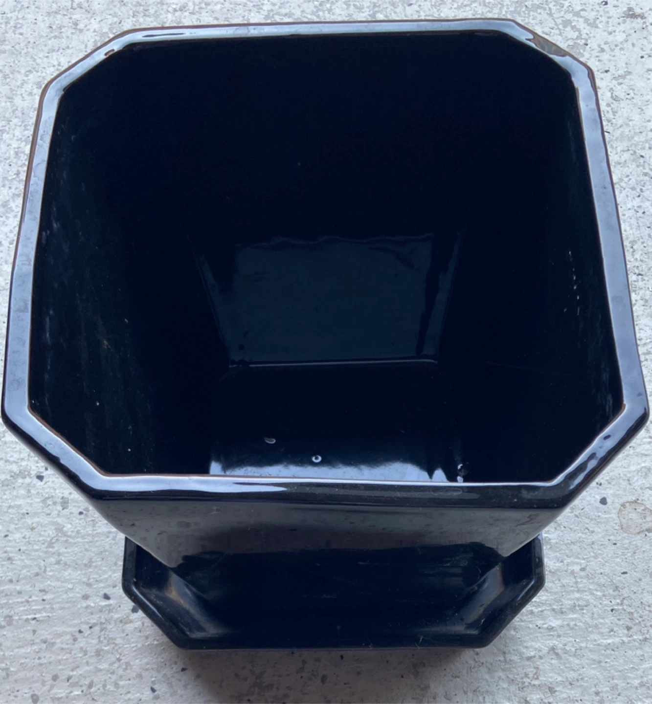 Selling a black octagon-shaped ceramic planter pot. It's in great condition and ready for your favourite plants! The planter comes with a matching saucer to help keep things tidy.