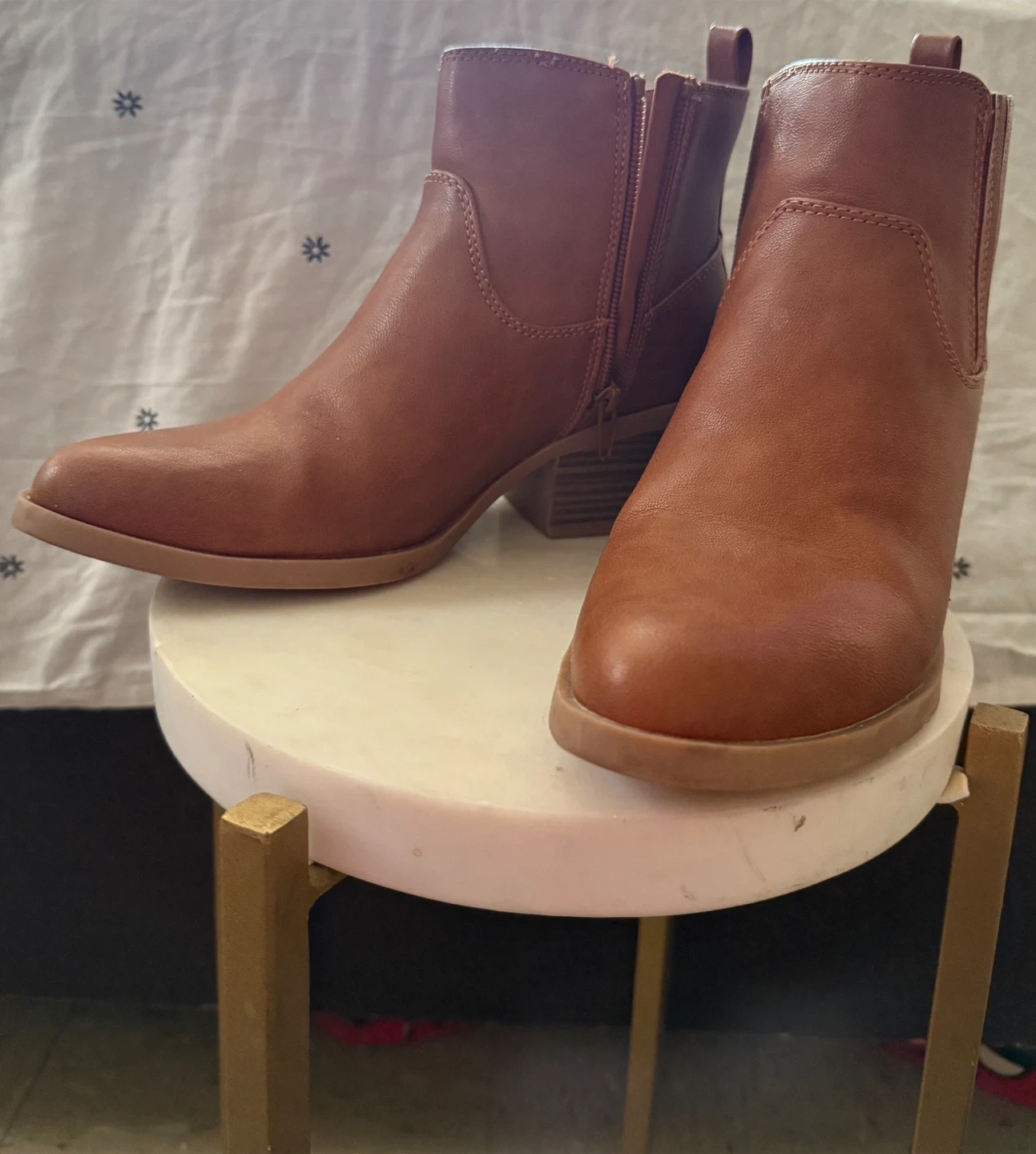 These are a pair of brown ankle boots. They have a small heel and a zipper on the side. These boots are size 8, like new condition and ready for a new home.