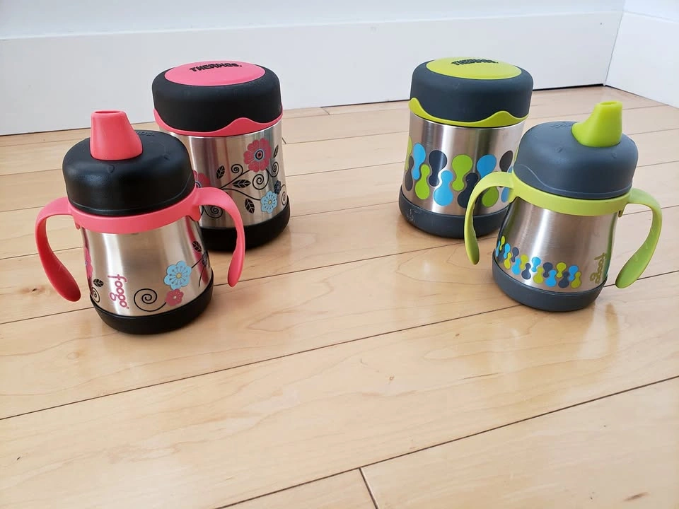 Selling matching sets of Thermos Foogo Phases stainless steel sippy cups with handles & Thermos Foogo vacuum insulated stainless steel food jar set. Each set is $20.