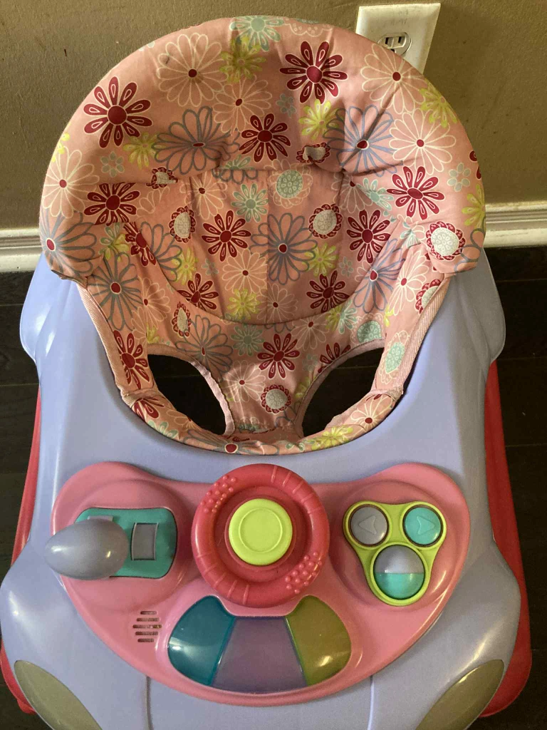 A cute baby walker with a floral patterned seat! It's in great shape and ready for a new little one to enjoy. The walker features a fun activity center with buttons and sounds to keep your baby entertained while they learn to walk. The seat is comfortable and supportive, making it perfect for babies who are just starting to explore their mobility