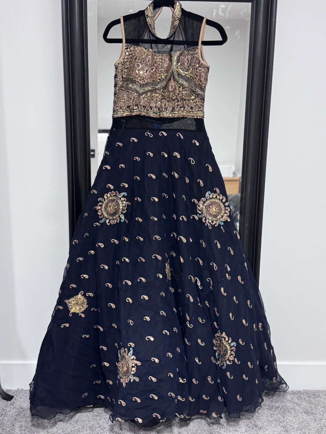 Beautiful black one piece dress with intricate gold embroidery. It's in great condition and perfect for a special occasion. The fabric is lightweight and flowy, making it comfortable to wear. The top is a sheer halter style with matching embroidery. It is a unique and elegant piece!
