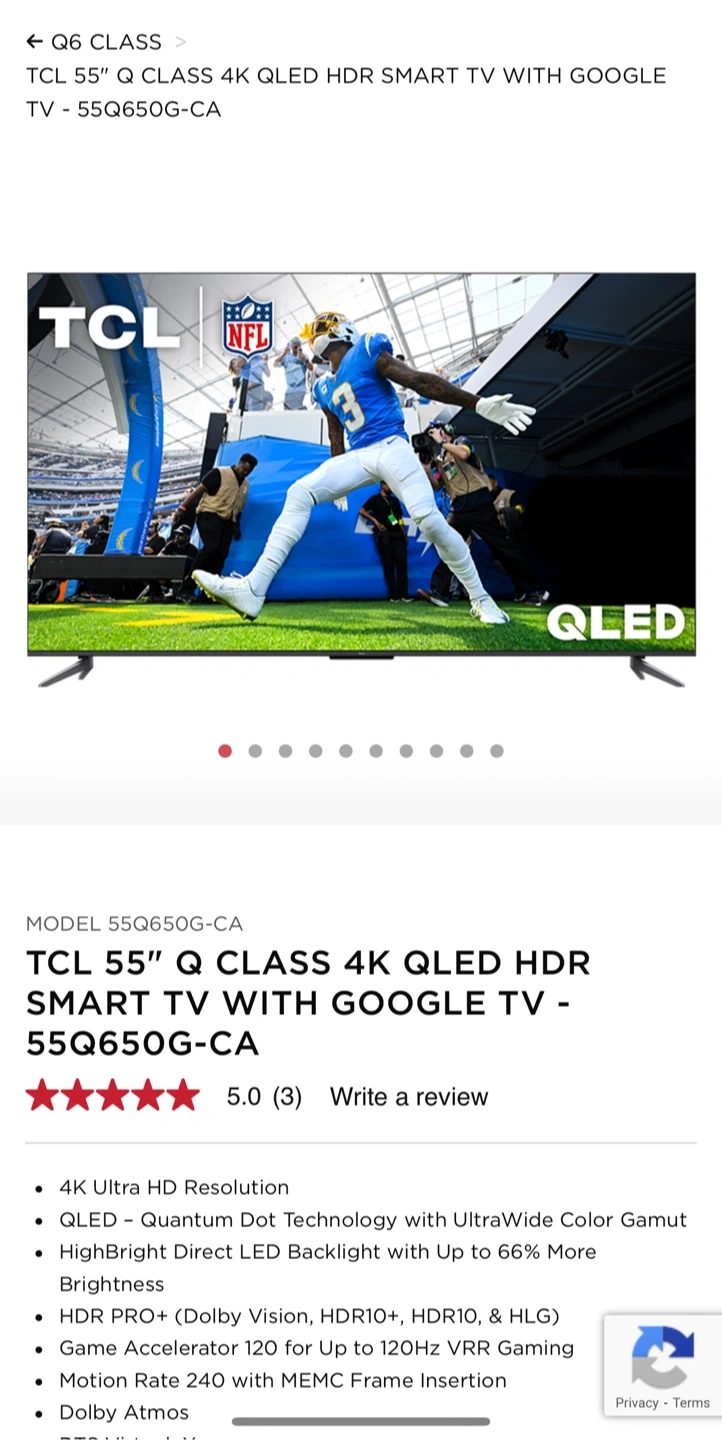 Selling a TCL 55" Q Class 4K QLED HDR Smart TV with Google TV, model number 55Q650G-CA. Key features include: - 4K Ultra HD Resolution - QLED - Quantum Dot Technology with UltraWide Color Gamut - High Bright Direct LED Backlight with up to 66% More Brightness - HDR PRO+ (Dolby Vision, HDR10+, HDR10, & HLG) - Game Accelerator 120 for Up to 120Hz VRR Gaming - Motion Rate 240 with MEMC Frame Insertion - Dolby Atmos TV unit is also available for extra charge. pickup only
