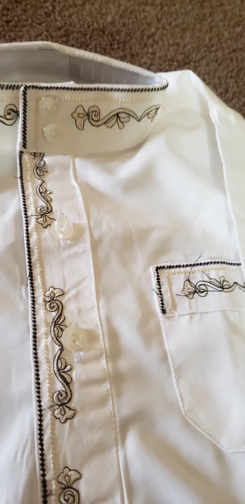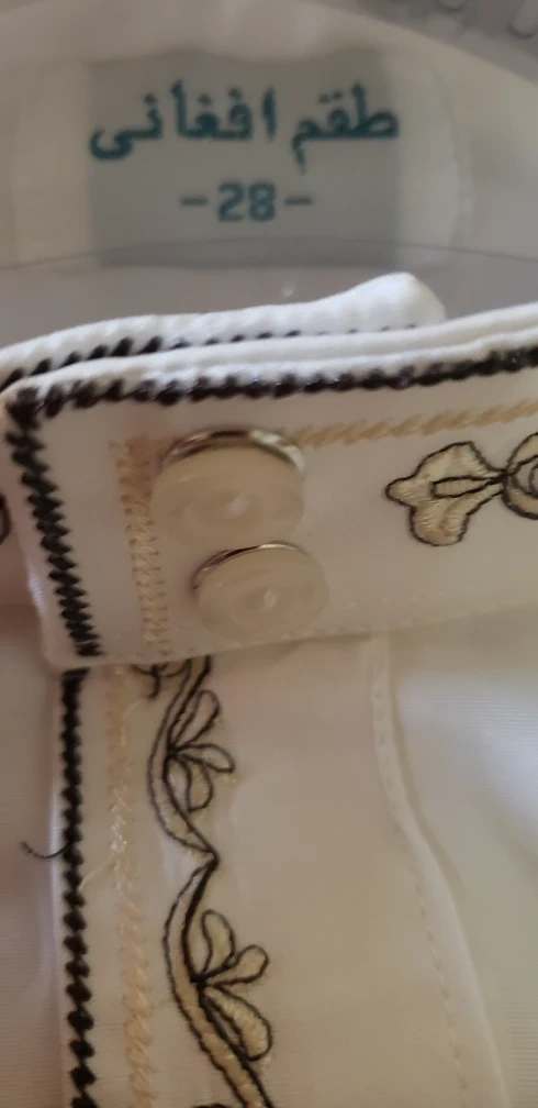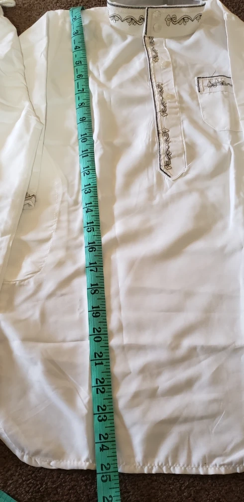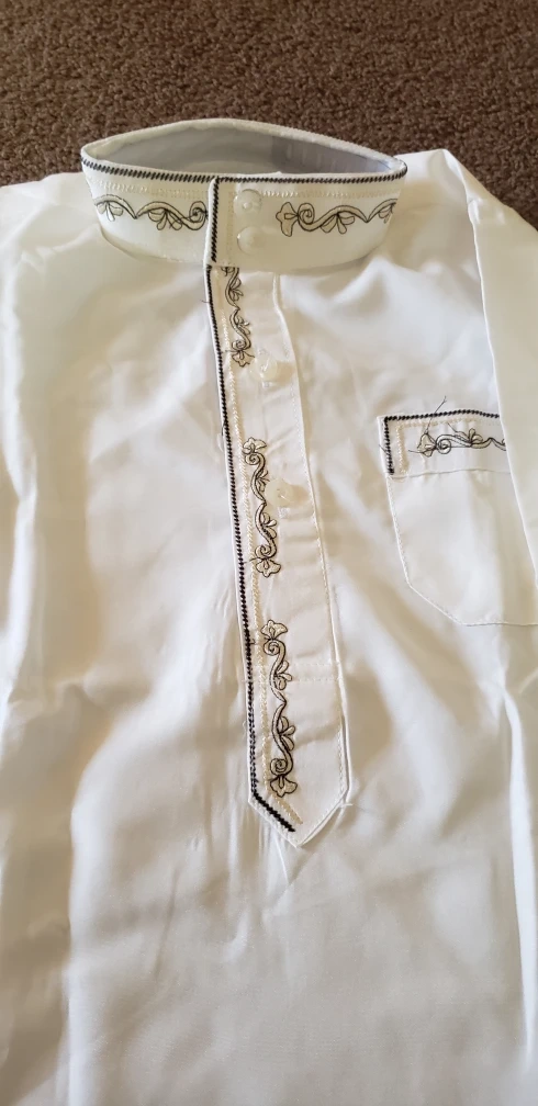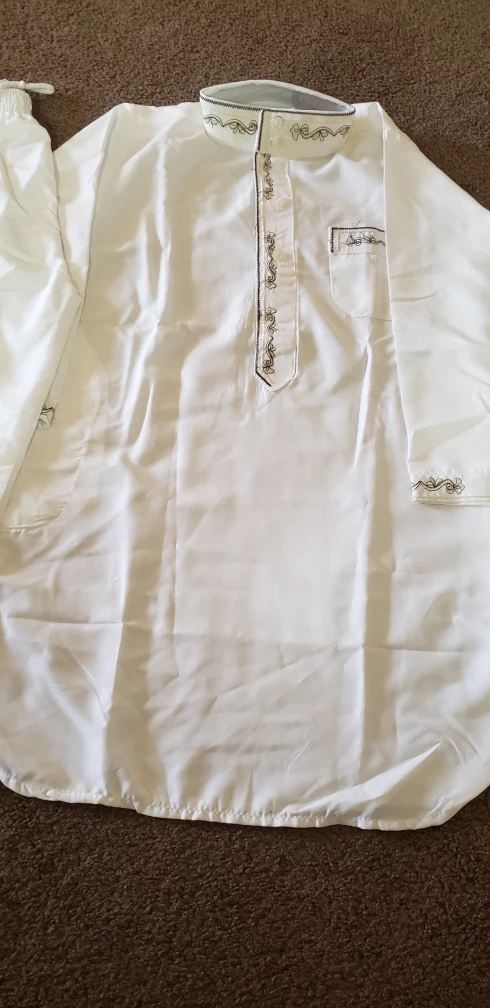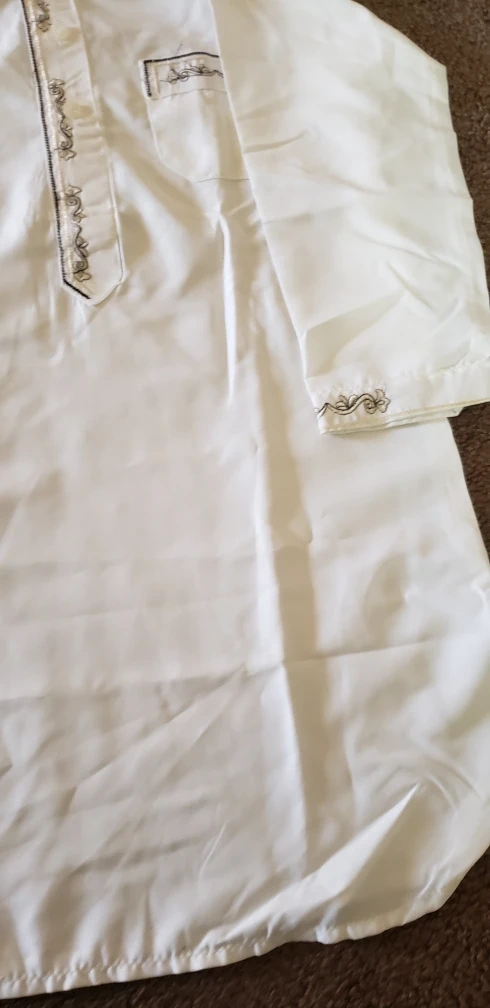 Selling a white men's thobe or kameez. It's in great condition and features some nice embroidery detailing. The size is 28 (likely referring to the length). Perfect for casual wear or special occasions!