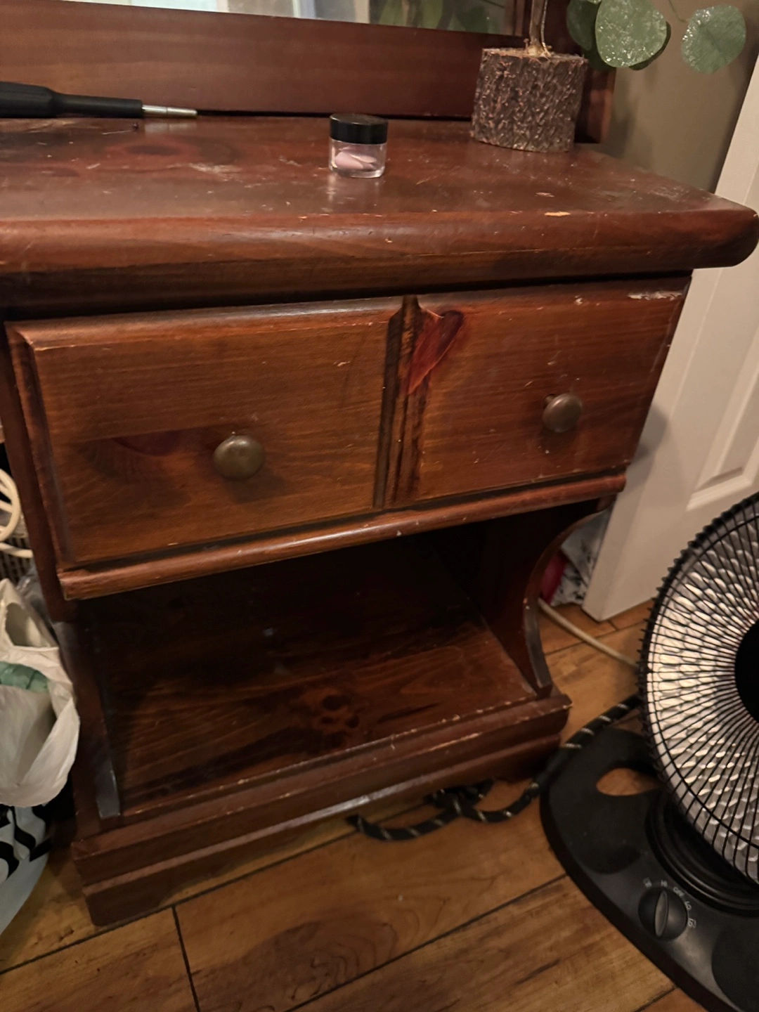 A charming wooden nightstand featuring two drawers. It shows some signs of use, adding to its vintage character. Perfect for adding a touch of rustic style to your bedroom