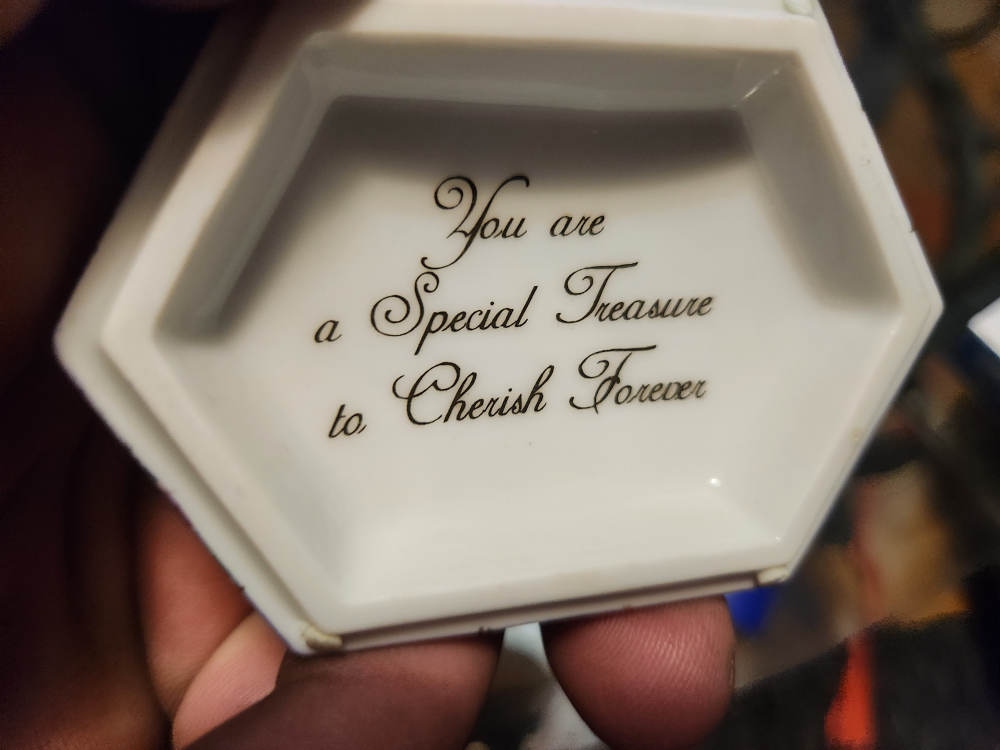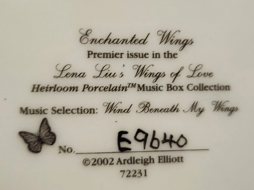 Selling a lovely "Enchanted Wings" music box, a premier issue in the Lena Liu's Wings of Love Heirloom Porcelain Music Box Collection! The music selection is "Wind Beneath My Wings". "You are a Special Treasure to Cherish Forever" is inscribed on the inside of the lid. It's a beautiful piece!