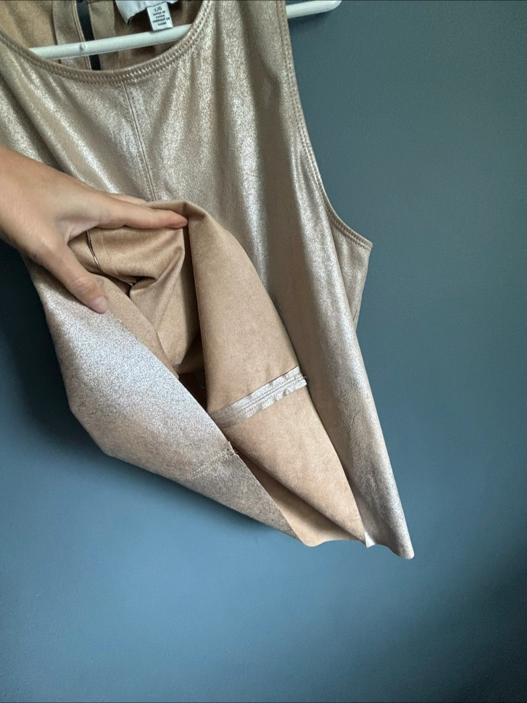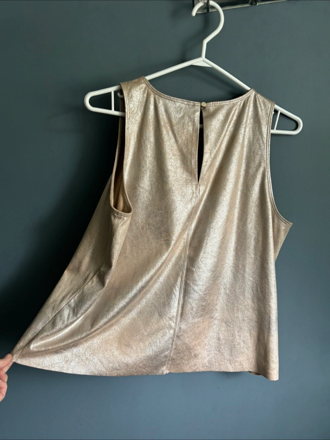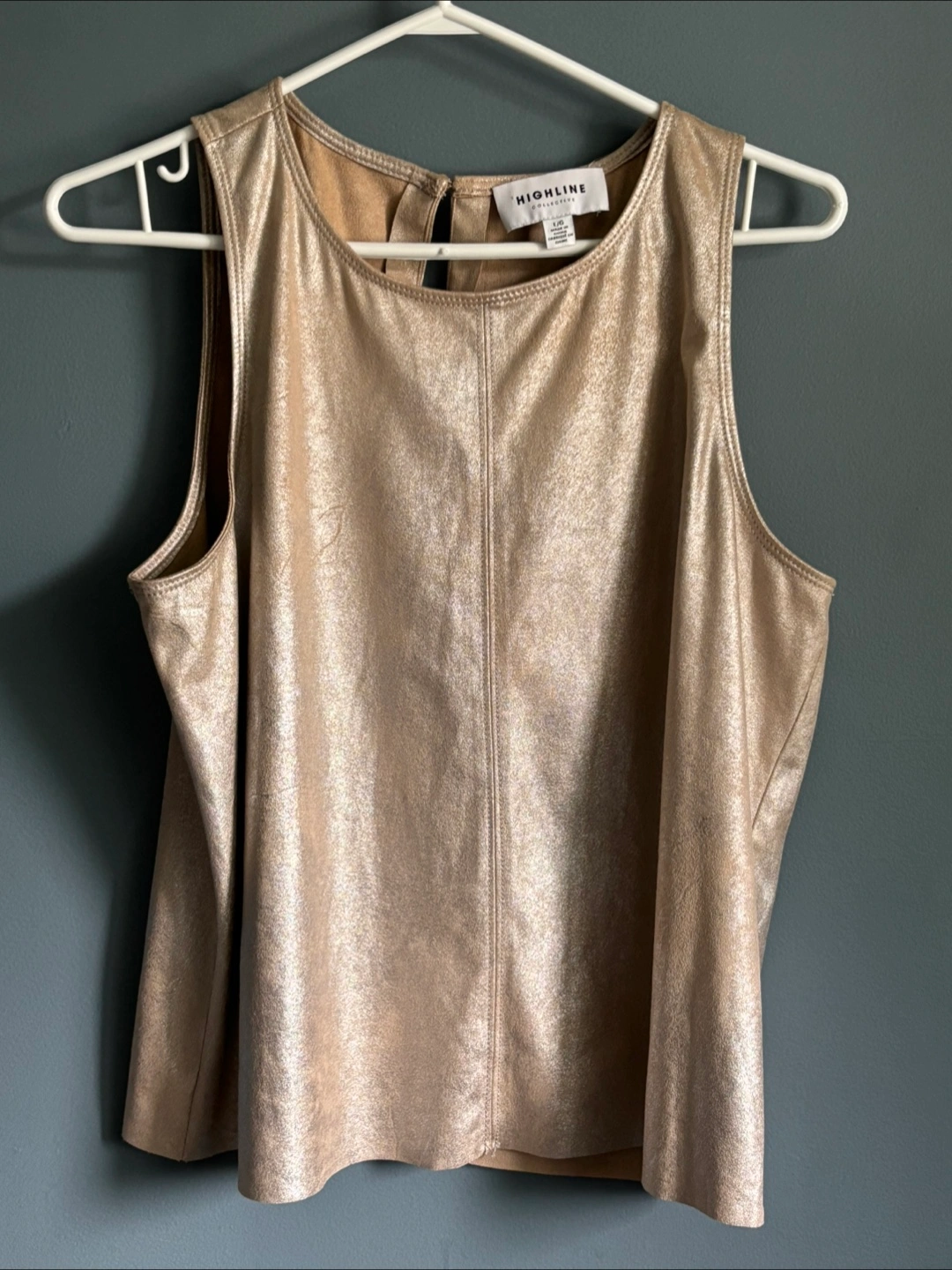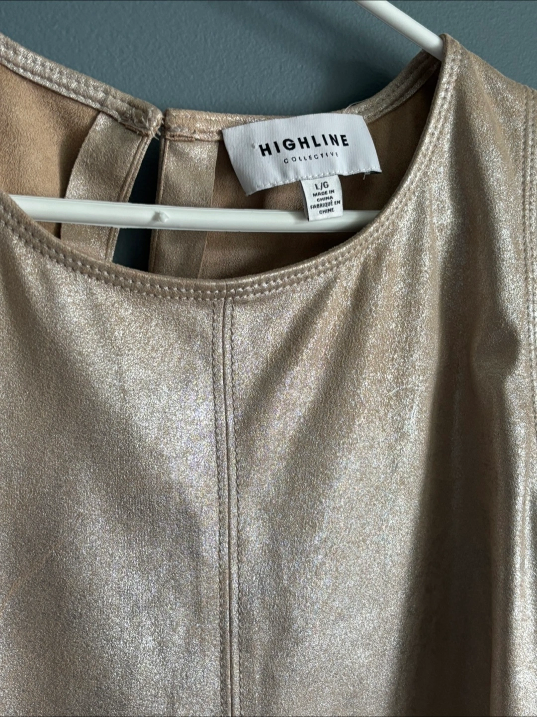 Add a touch of sparkle to your wardrobe with this Highline Collective gold tank top! It's a size large and made of 85% polyester and 15% spandex for a comfortable fit. Perfect for dressing up or down