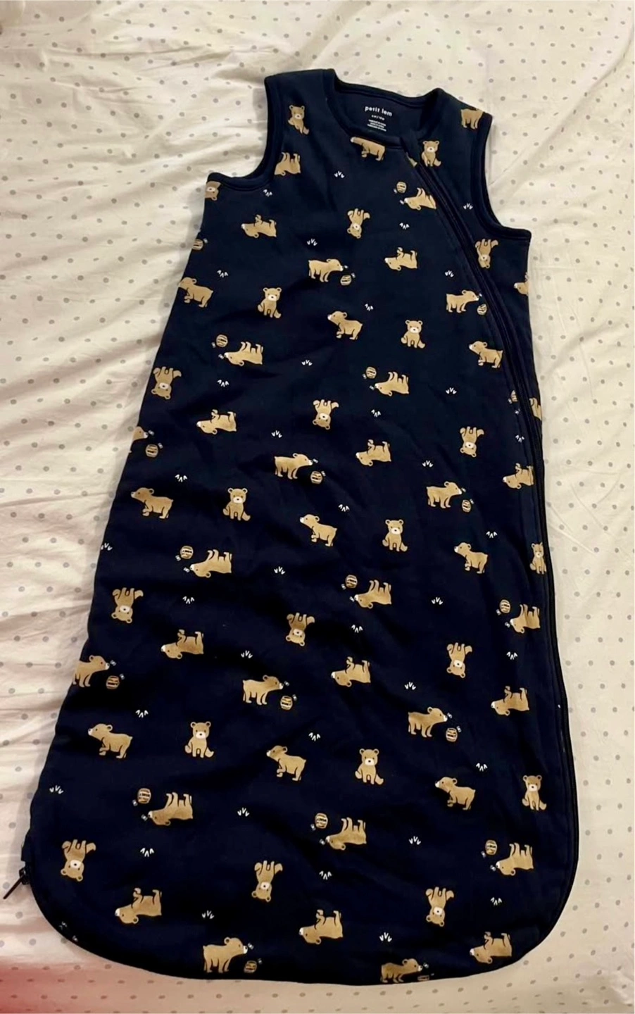 Selling a Petit Lem sleep sack in size 6-18 months. It's new and features a cute bear pattern. Perfect for keeping your little one cozy and safe during sleep