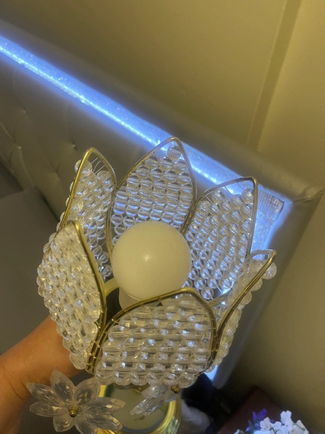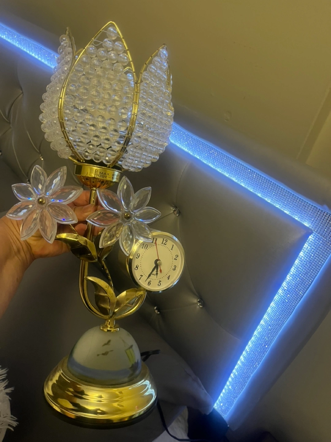 Selling a vintage bedside lamp in a unique tulip design! It features a built-in clock and a lovely gold finish. The flower accents add a touch of elegance to any room. It's in great condition and ready to brighten up your space!