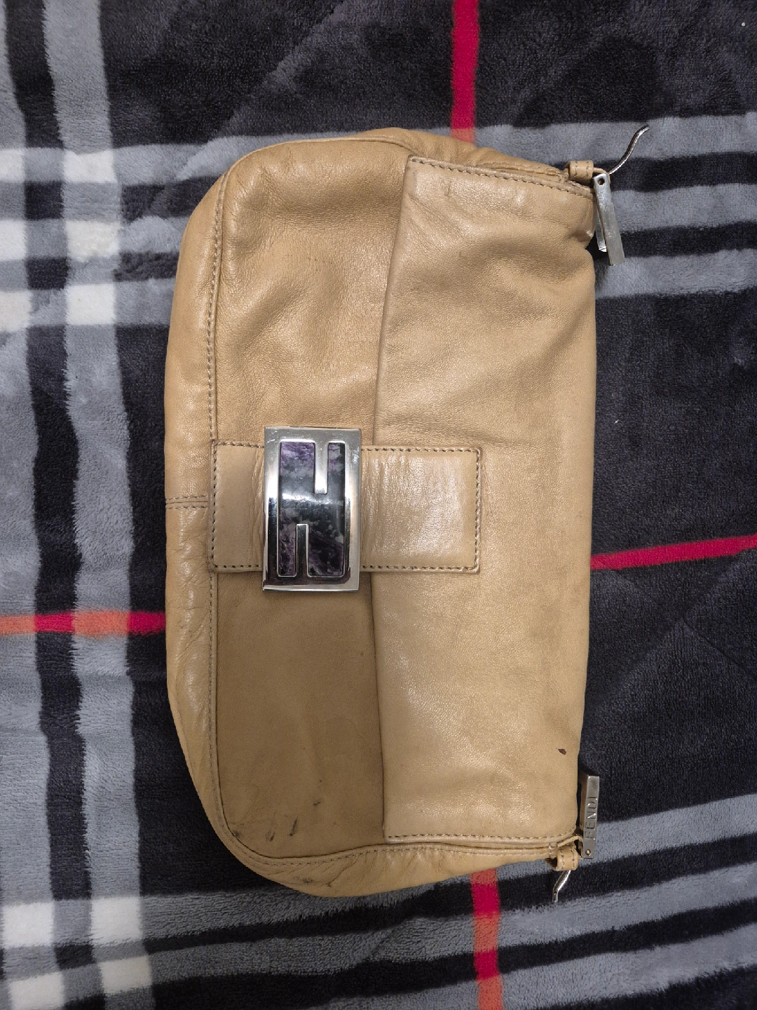 Selling a Fendi clutch in a tan leather. It's in good condition! The interior is a beautiful purple. There are some signs of wear, as pictured. no strap . original price is $1,271