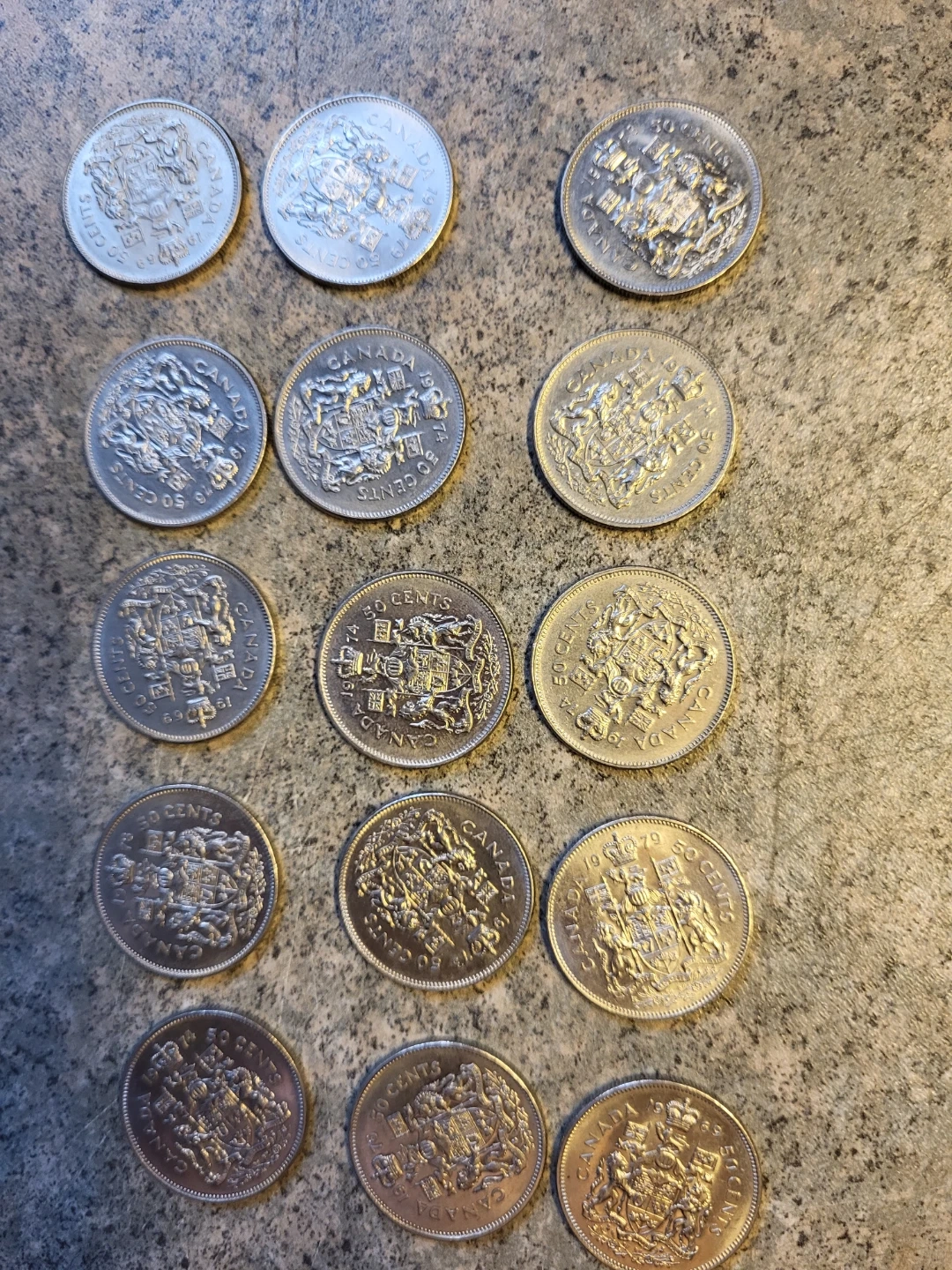 Selling 15 Canadian Half dollar coins. They are in circulated condition and come in a protective sleeve