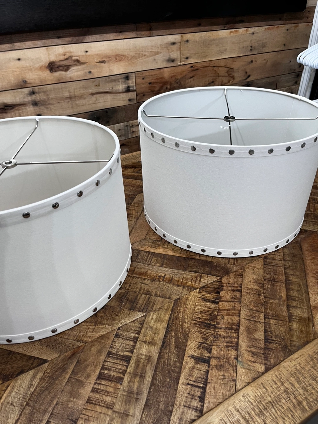 Selling a pair of white drum lamp shades with a silver stud design. great condition. Measures at 15β diameter x 10β high.