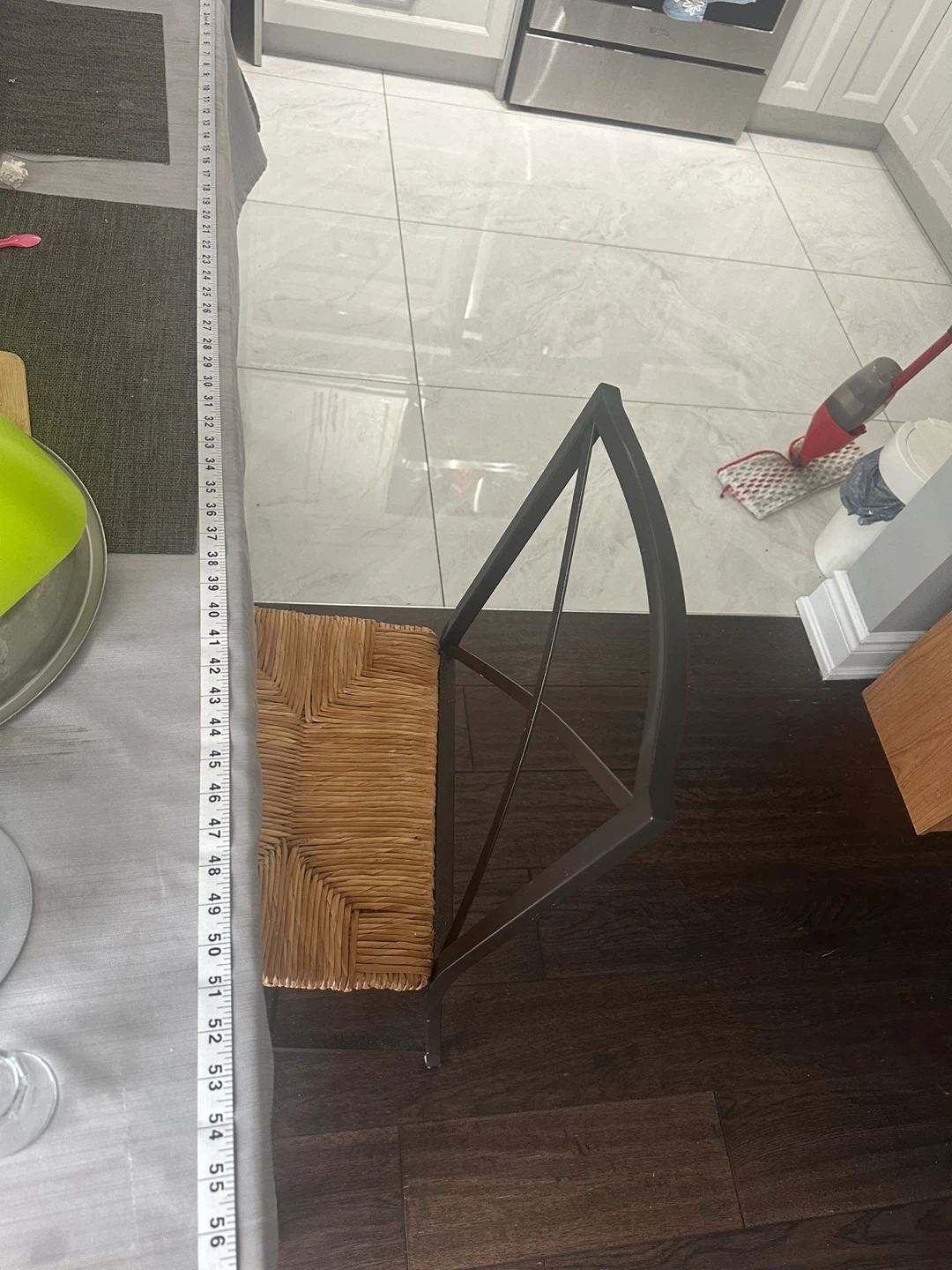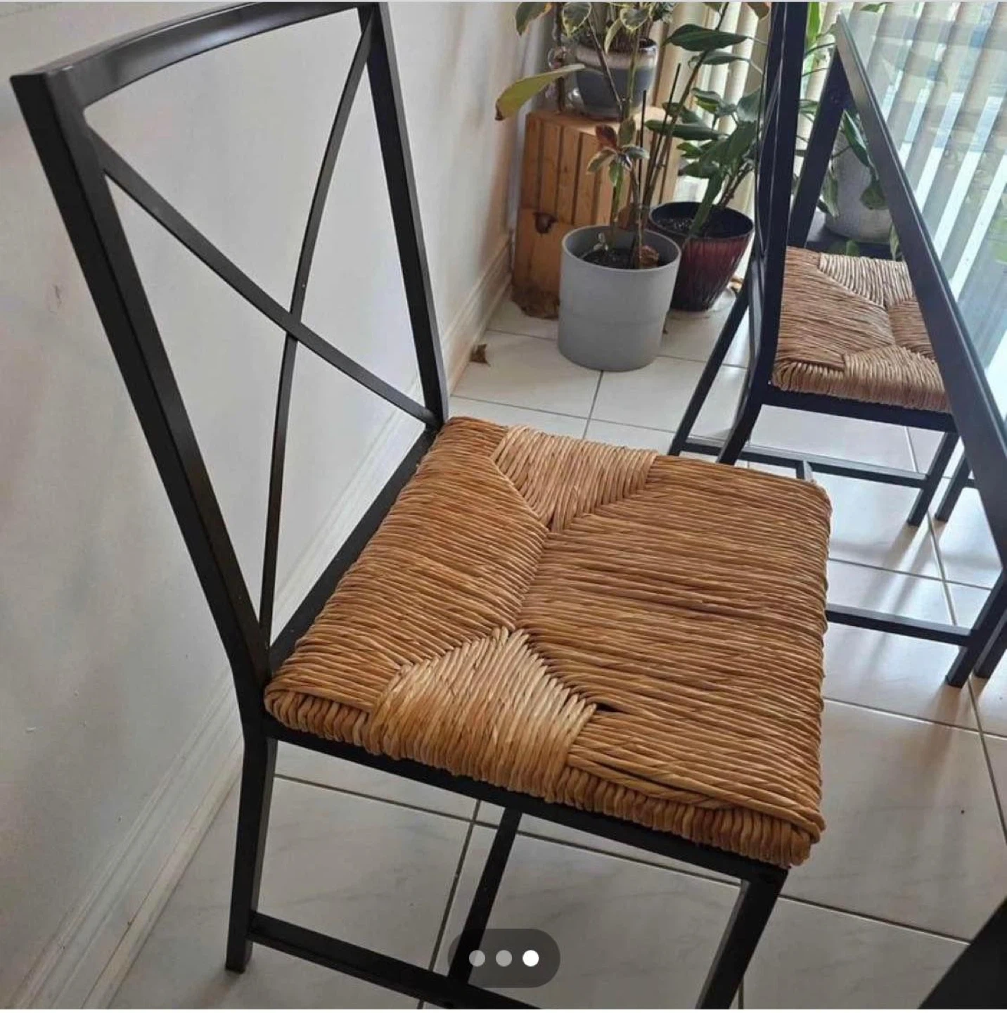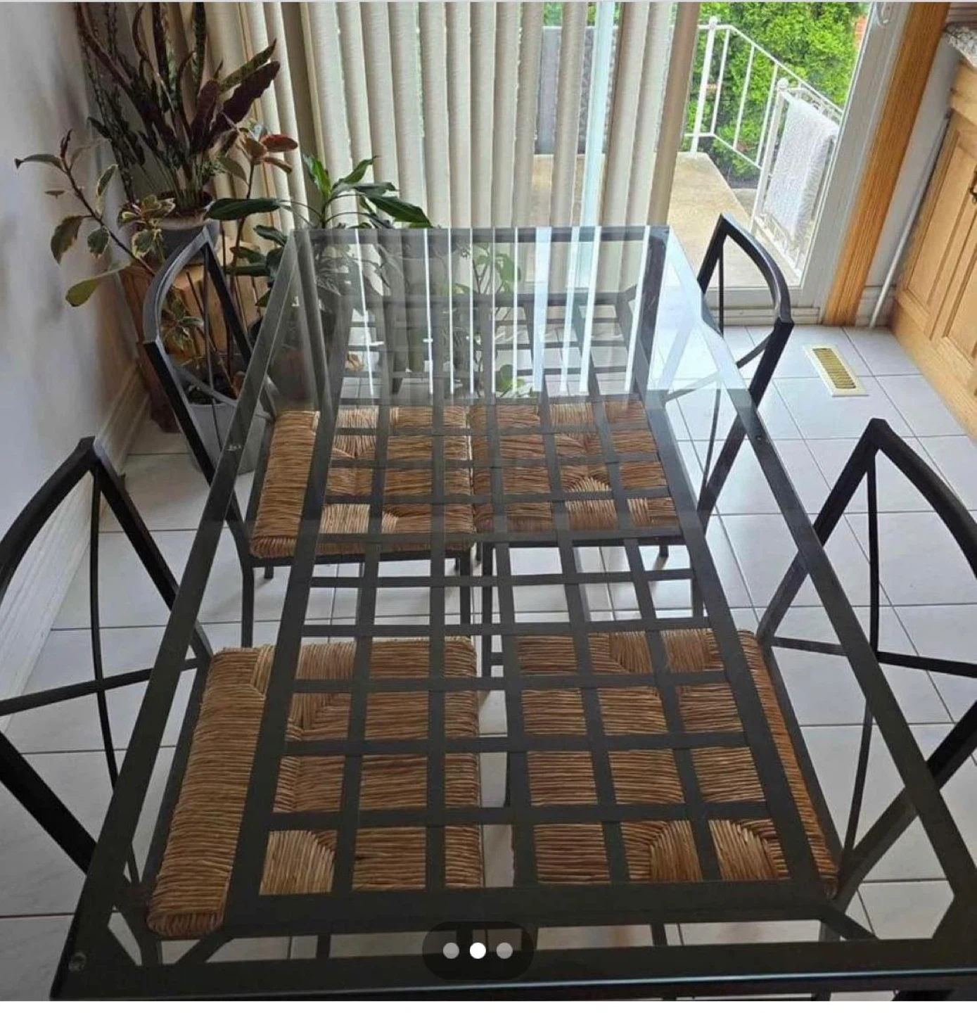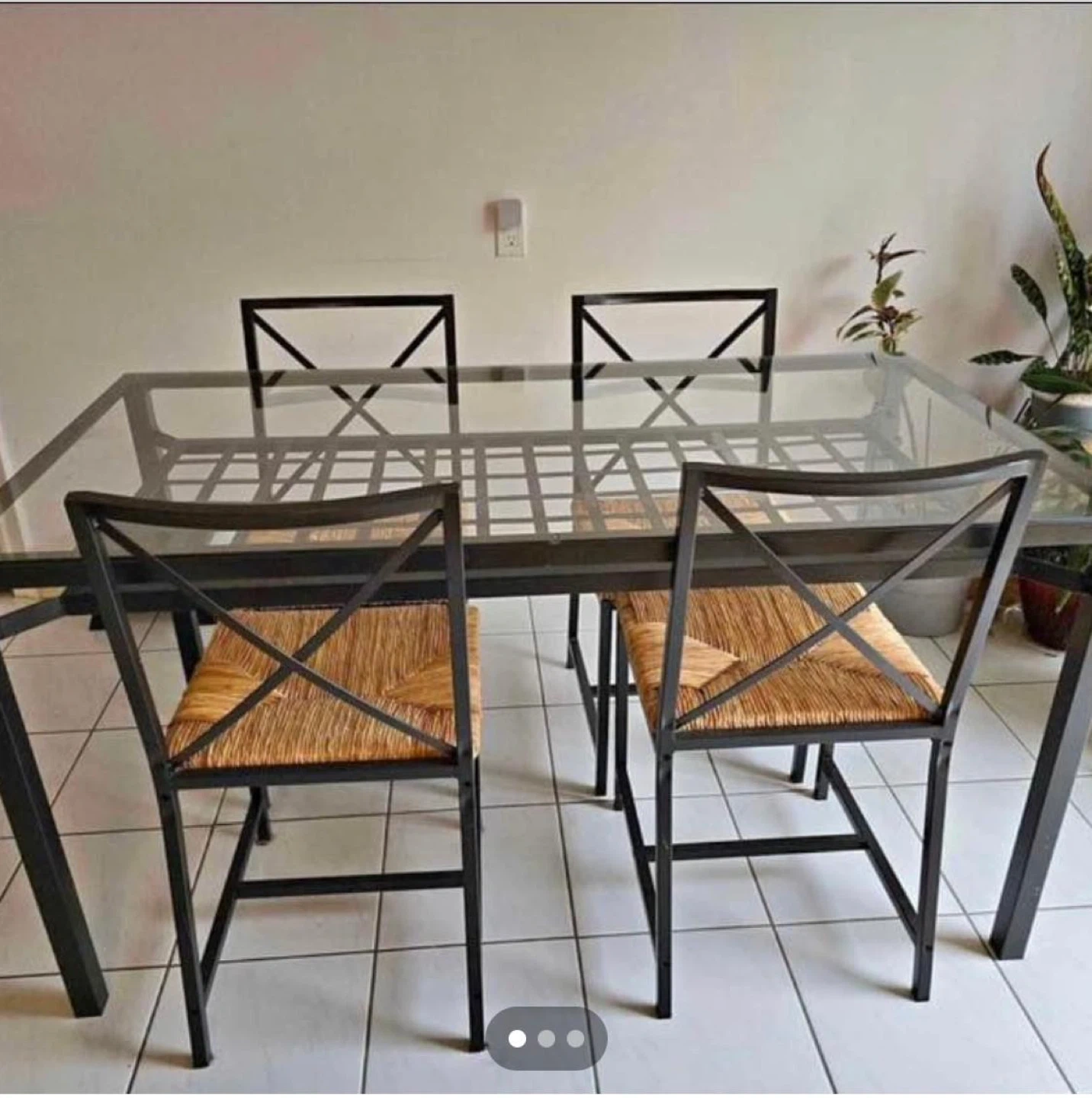 Looking to sell this dining table set! It comes with a glass top table and four matching chairs. The chairs have a woven seat design. The set is in brand new condition and would be a great addition to any dining space