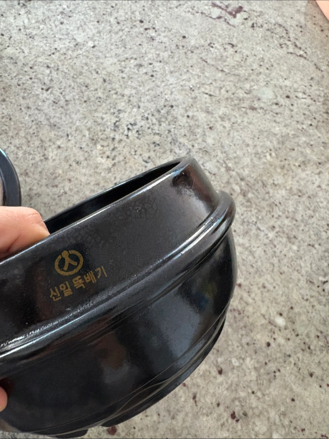 Selling a traditional Korean Stone pot, known as a ddukbaegi. It's perfect for cooking and serving stews and soups. The pot is black and comes with a matching lid. It has a logo on the side and says "KOREA" on the bottom.