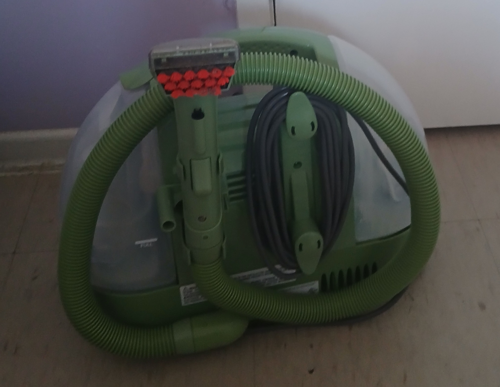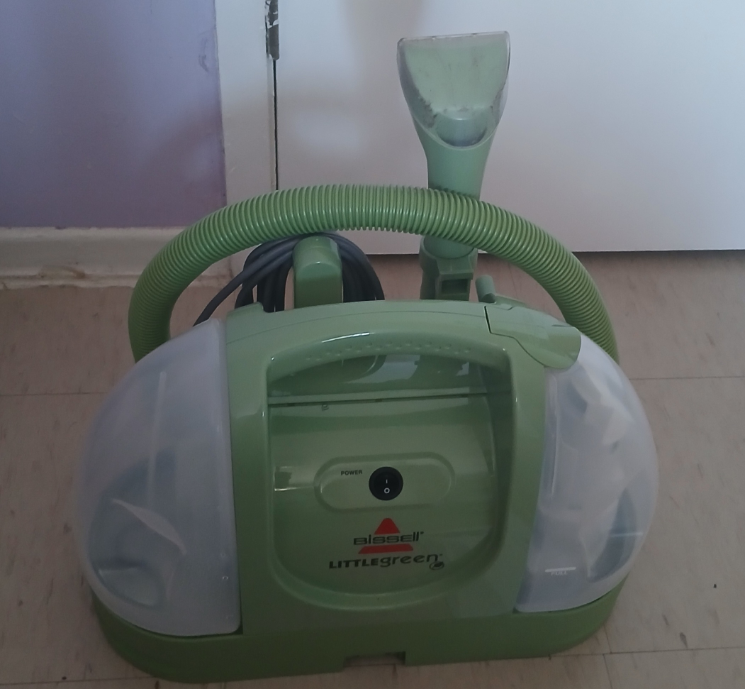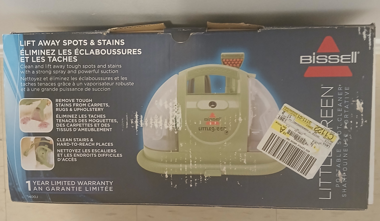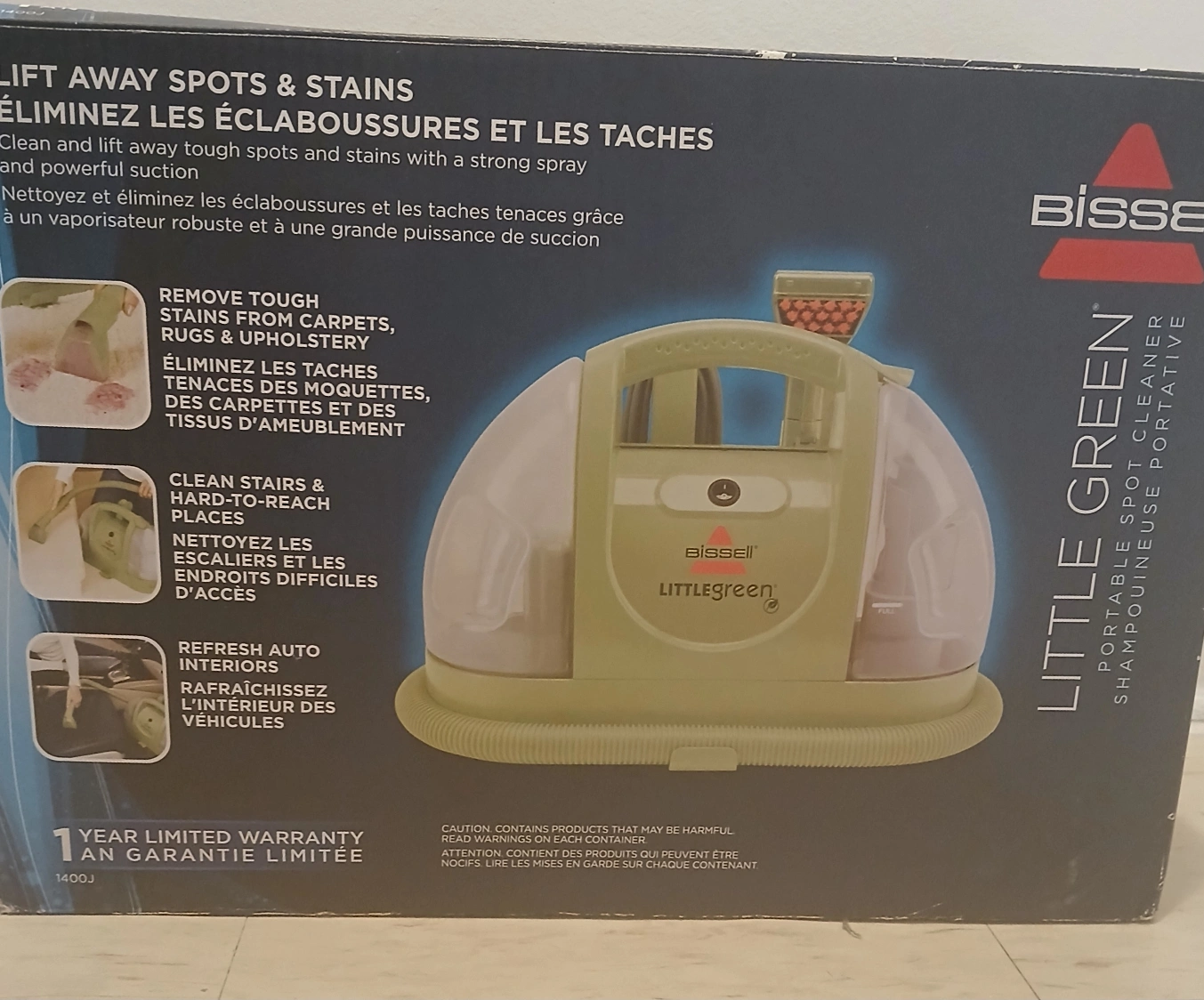 Get those tough spots and stains lifted away with the Bissell Little Green! It's a portable spot cleaner with a strong spray and powerful suction. Great for carpets, rugs, upholstery, stairs, and even your car's interior. Comes with the original box and user guide