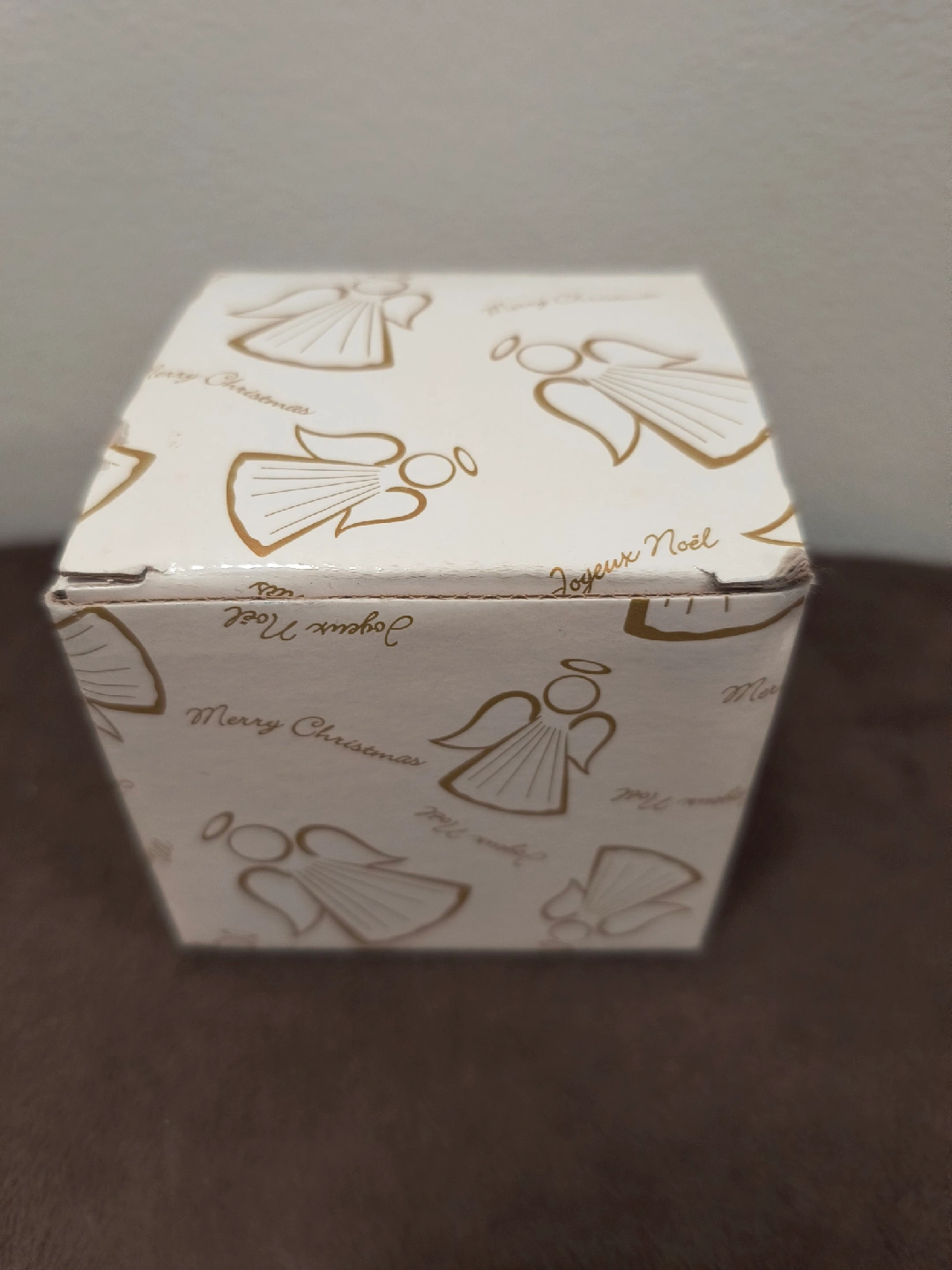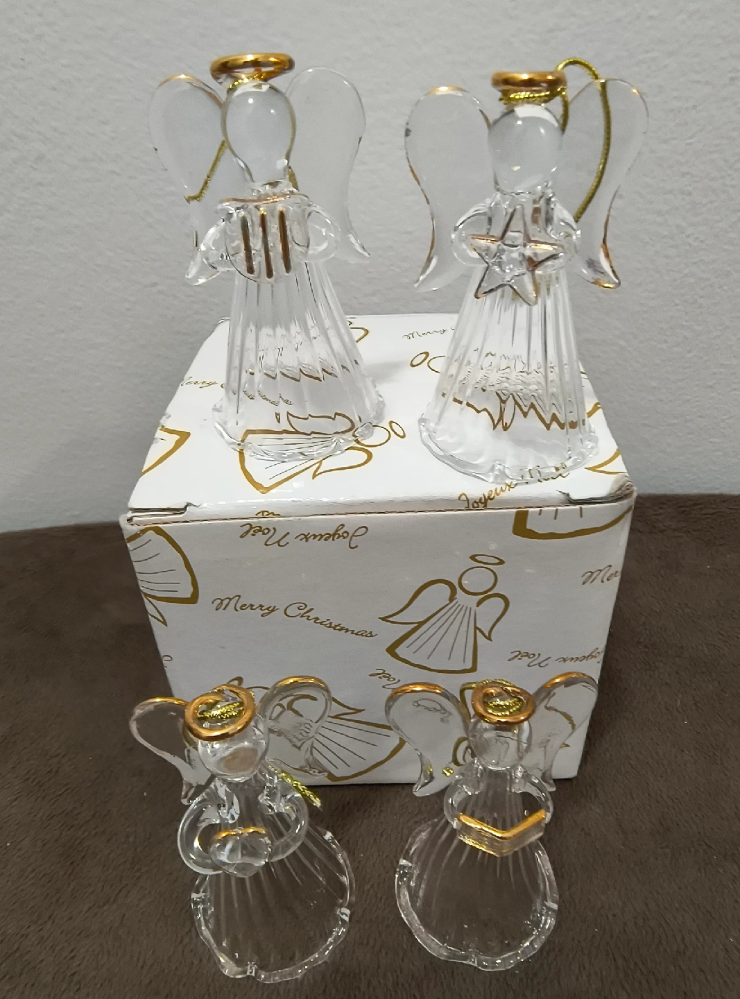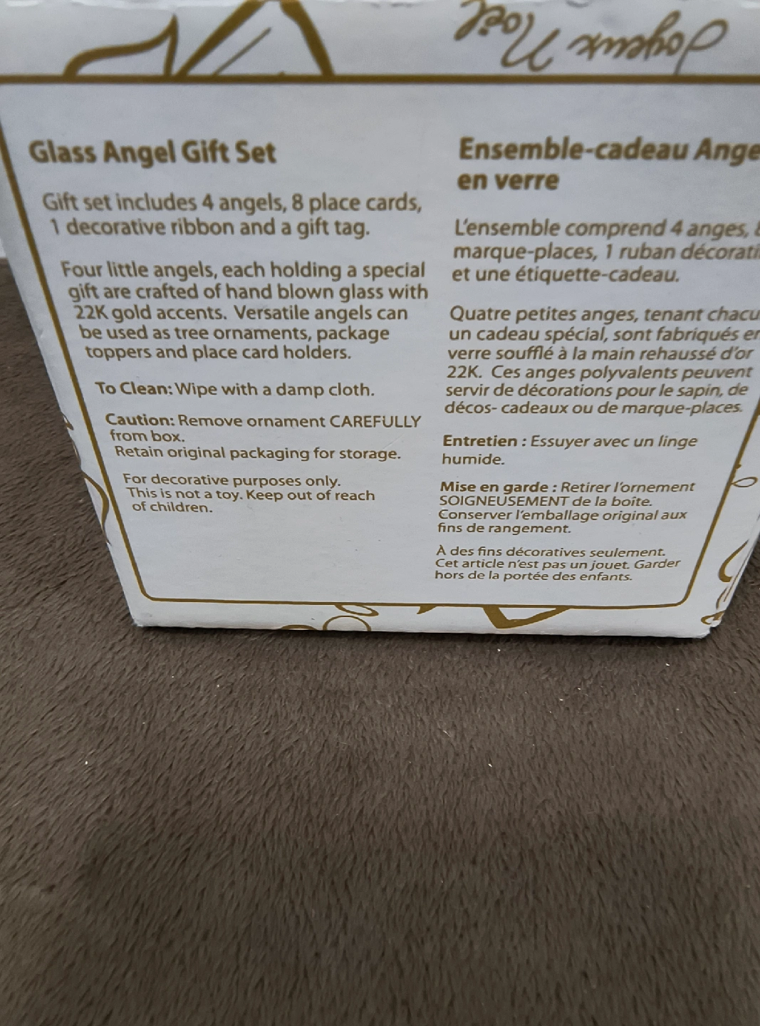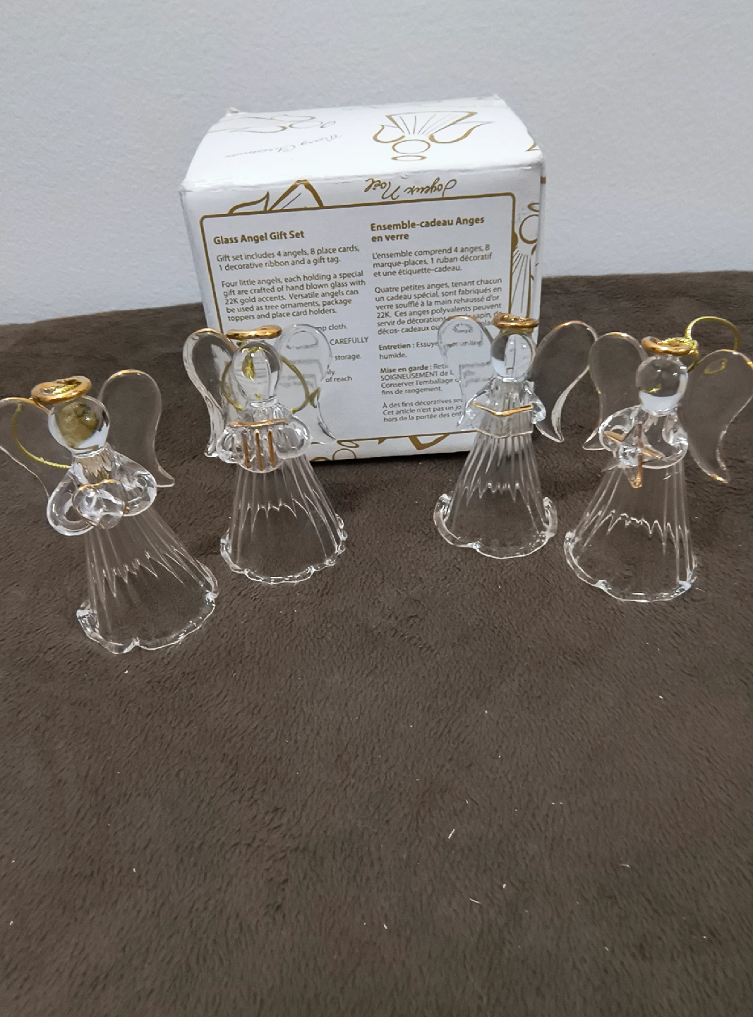 Selling a charming glass angel ornament gift set! It includes 4 adorable angels, each holding a special gift. They're crafted from hand-blown glass with lovely 22K gold accents. These versatile angels can be used as tree ornaments, package toppers, or even place card holders. The gift set also includes 8 place cards, a decorative ribbon, and a gift tag. Comes with the original box