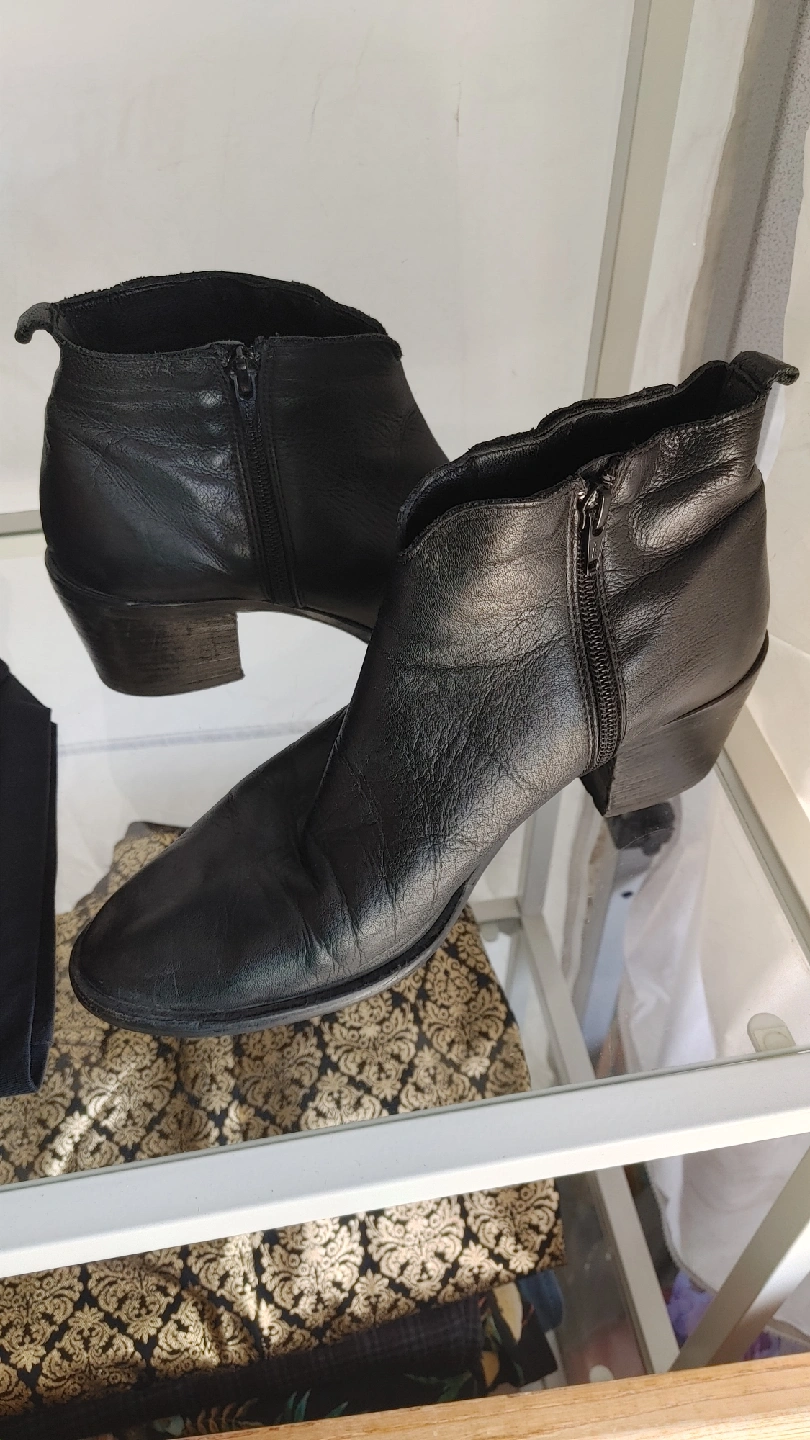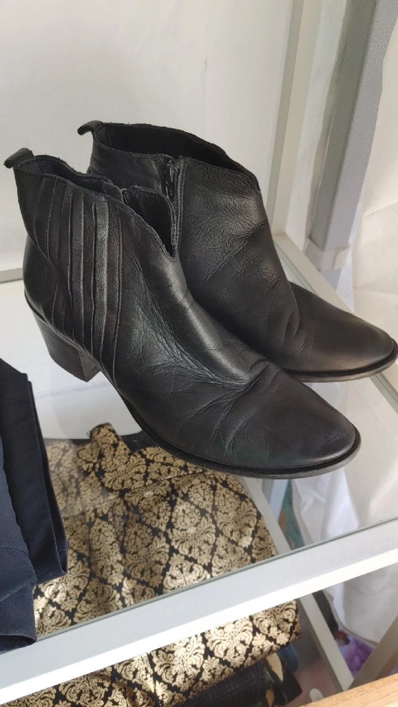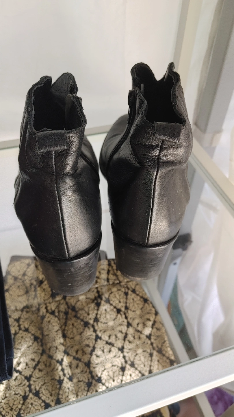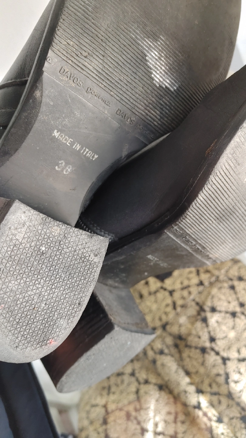 Selling a pair of black leather ankle boots. They're in good condition with some signs of wear on the soles. The size is 38 (European sizing), made in Italy.