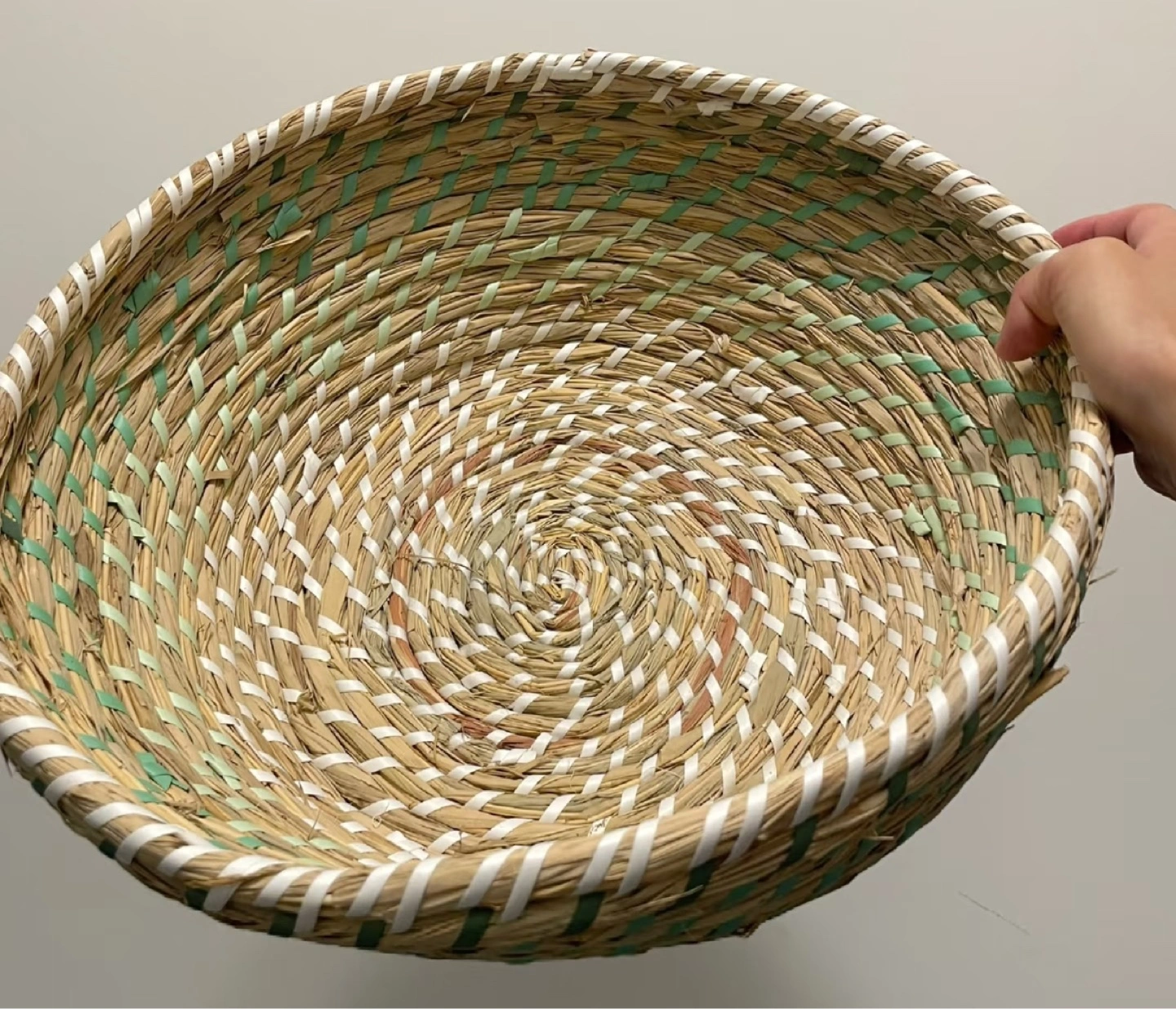 Selling a woven basket, perfect as a decorative bowl or for storage. It features a spiral pattern with natural tones accented by white and light green. It's in great condition and ready to add a touch of rustic charm to your home