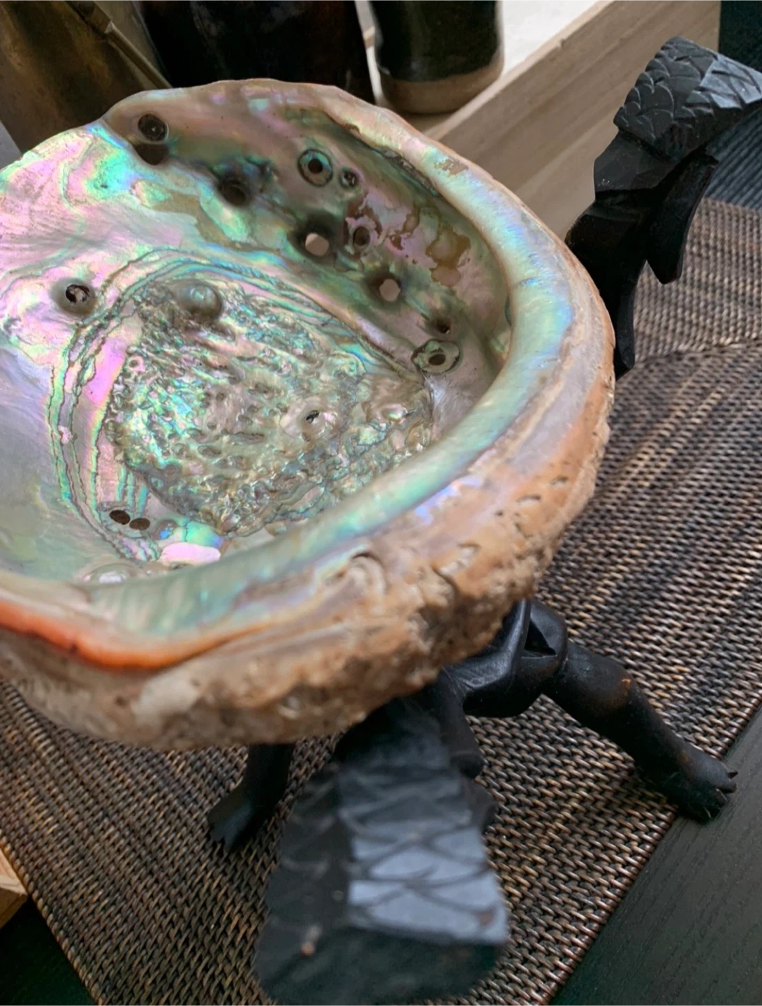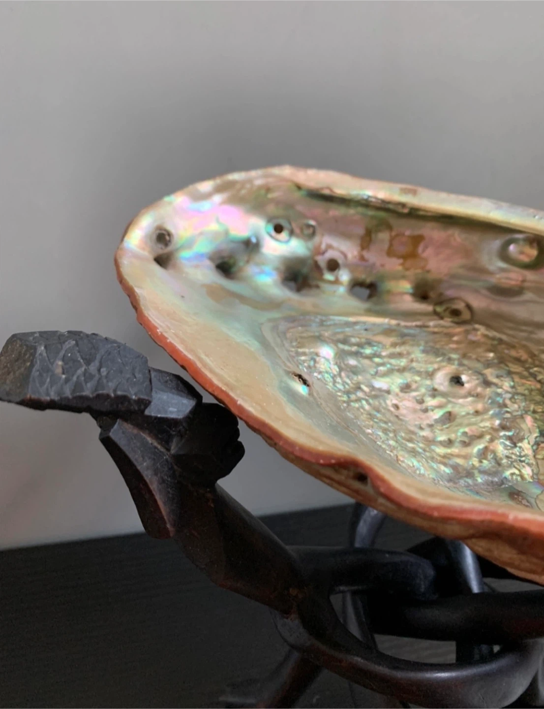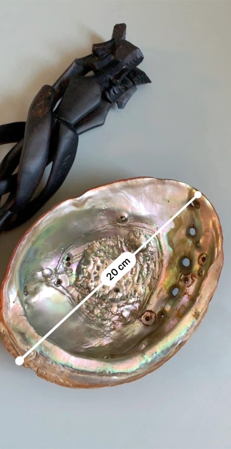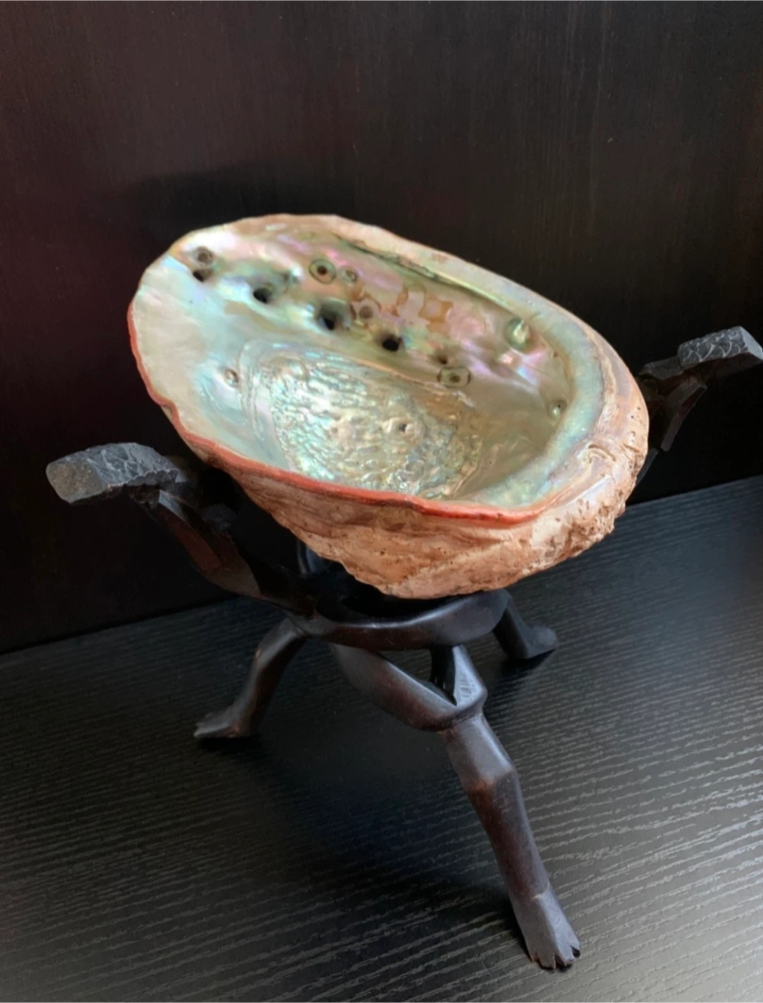 •Beautiful large abalone shell bowl displayed on a distinctive vintage wooden African trinity stand.