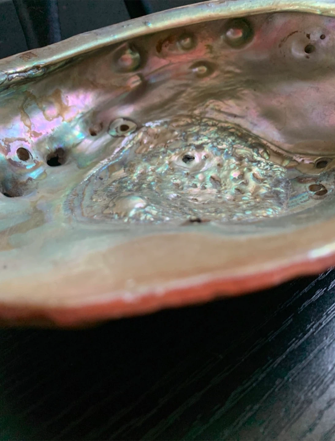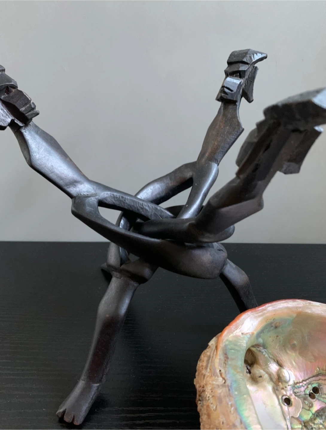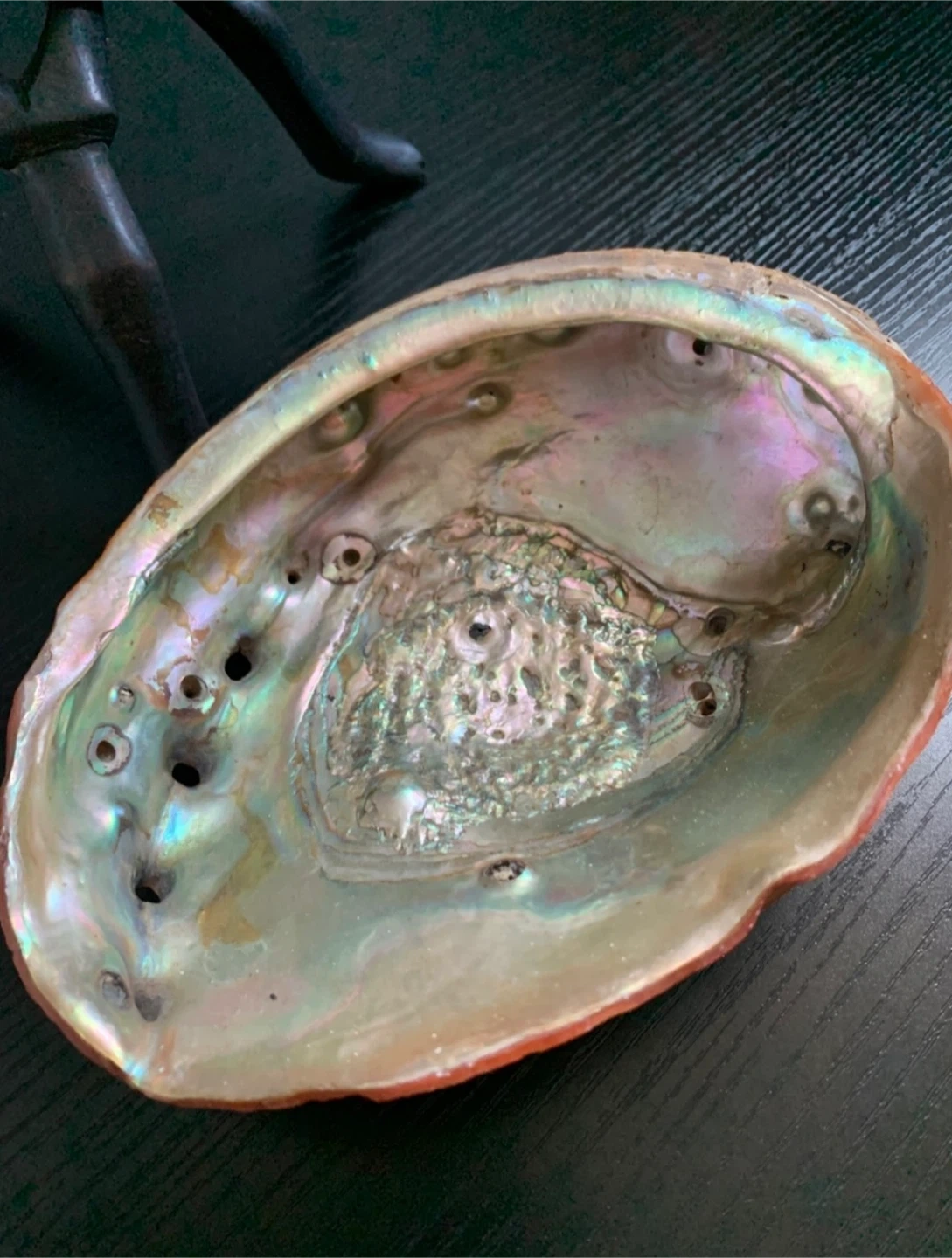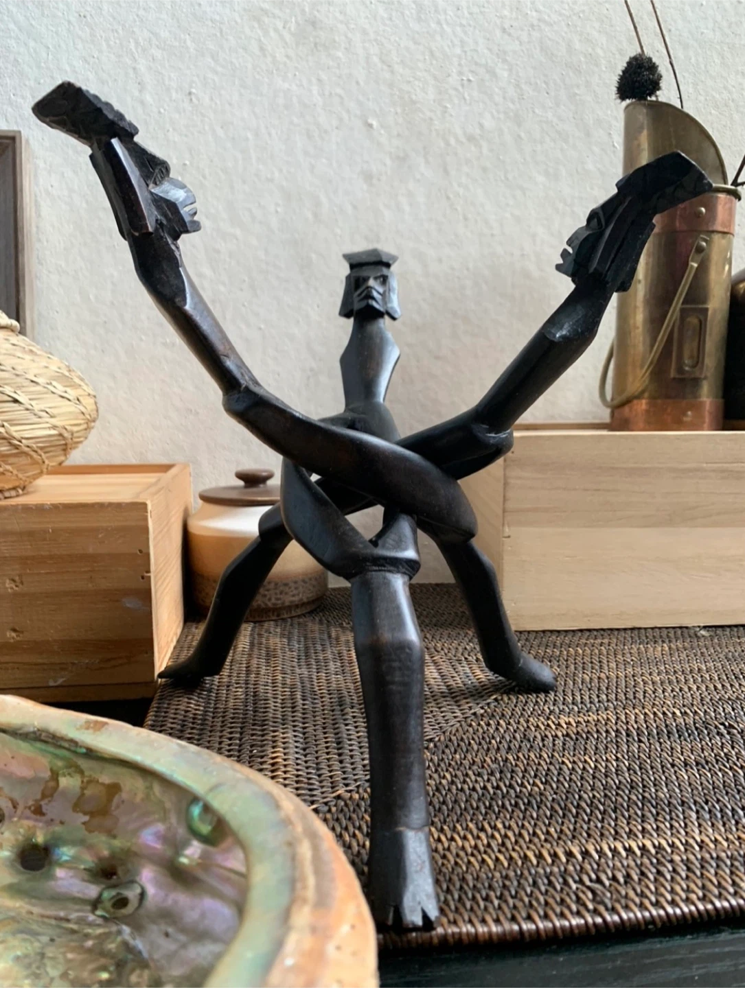 •Beautiful large abalone shell bowl displayed on a distinctive vintage wooden African trinity stand.