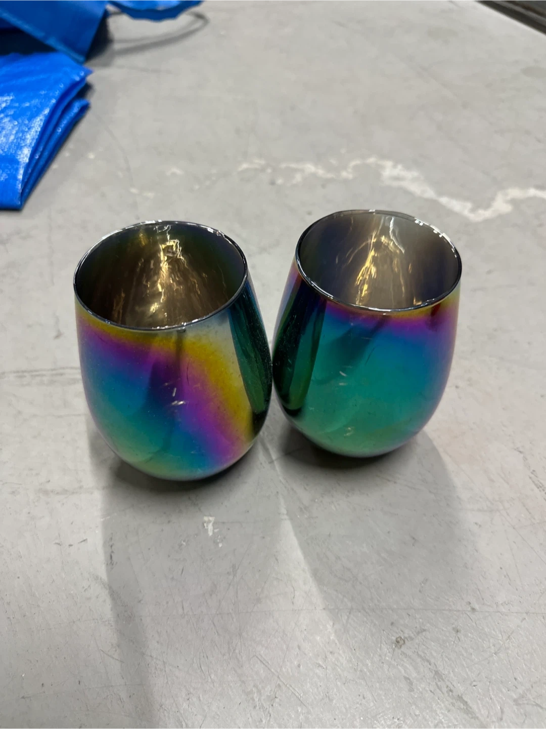 Selling a set of two iridescent stemless wine glasses! They have a beautiful rainbow sheen that catches the light. Perfect for adding a touch of colour to your table setting or enjoying your favourite wine in style.