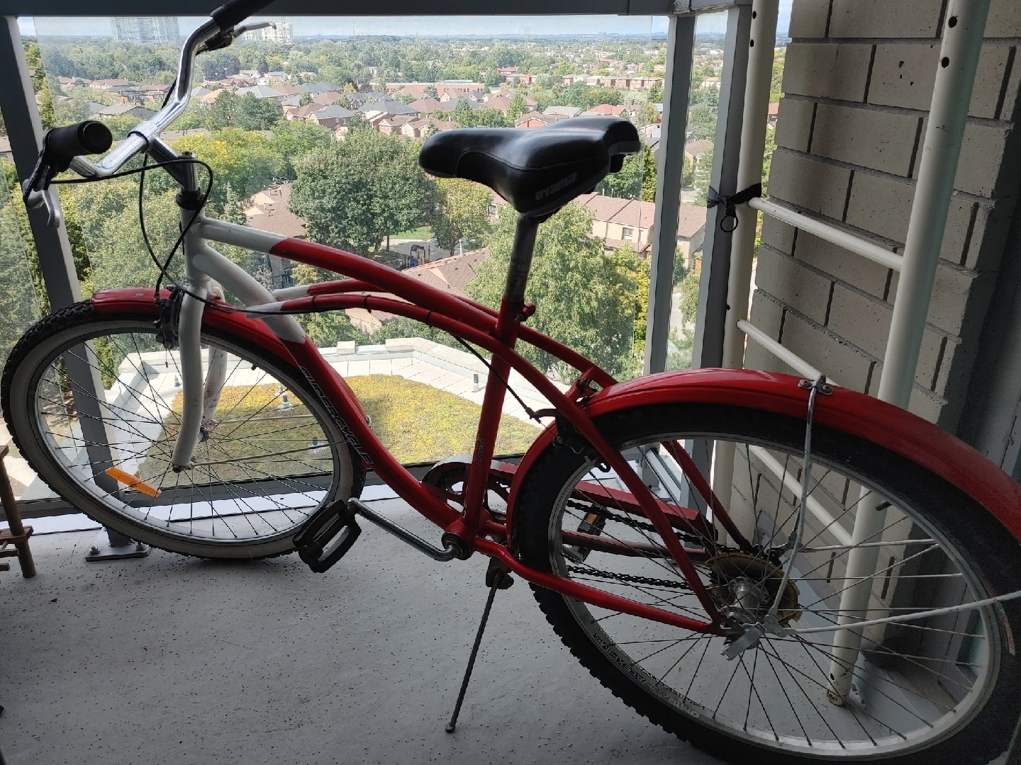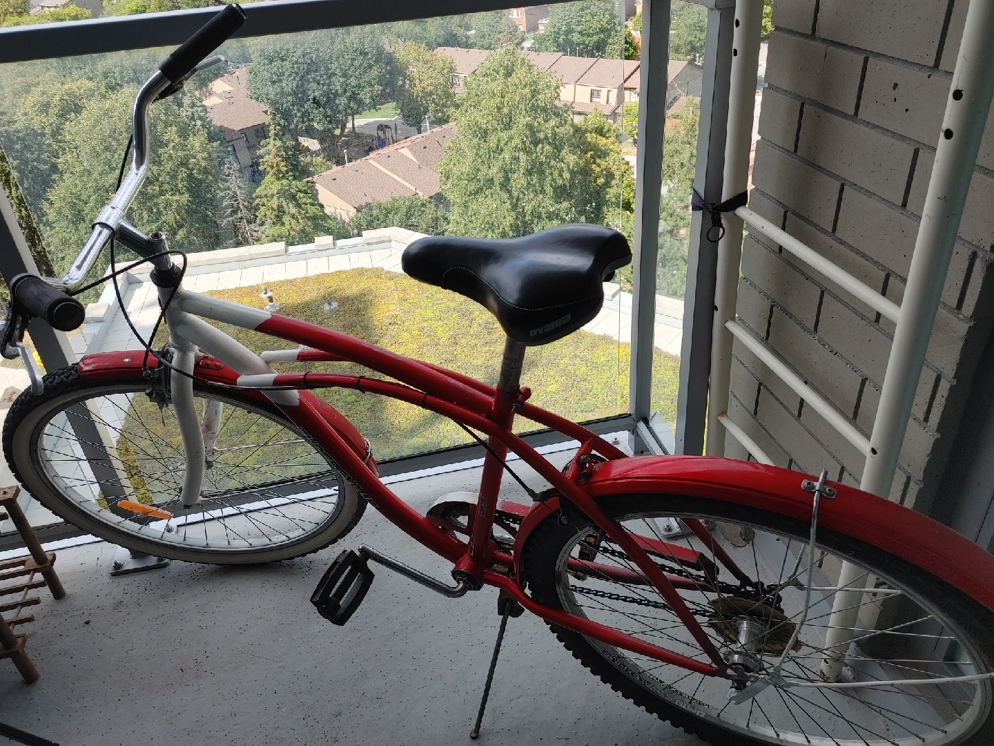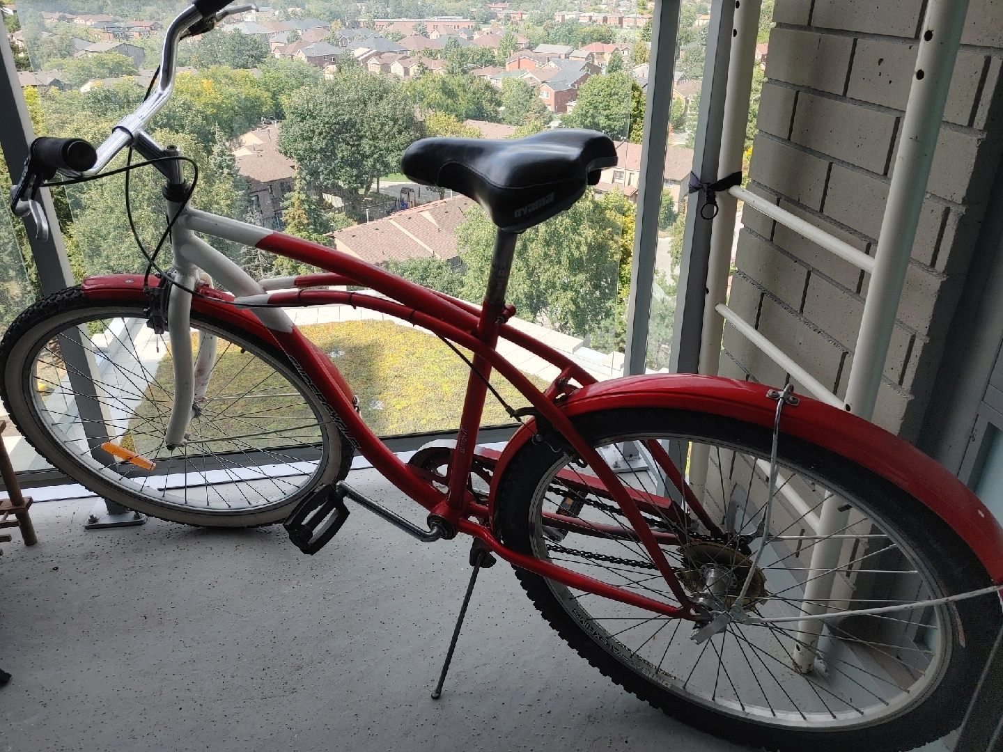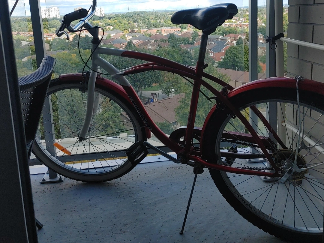 Selling a Supercycle cruiser bike in red and white. It's in good condition and ready for some leisurely rides around town!