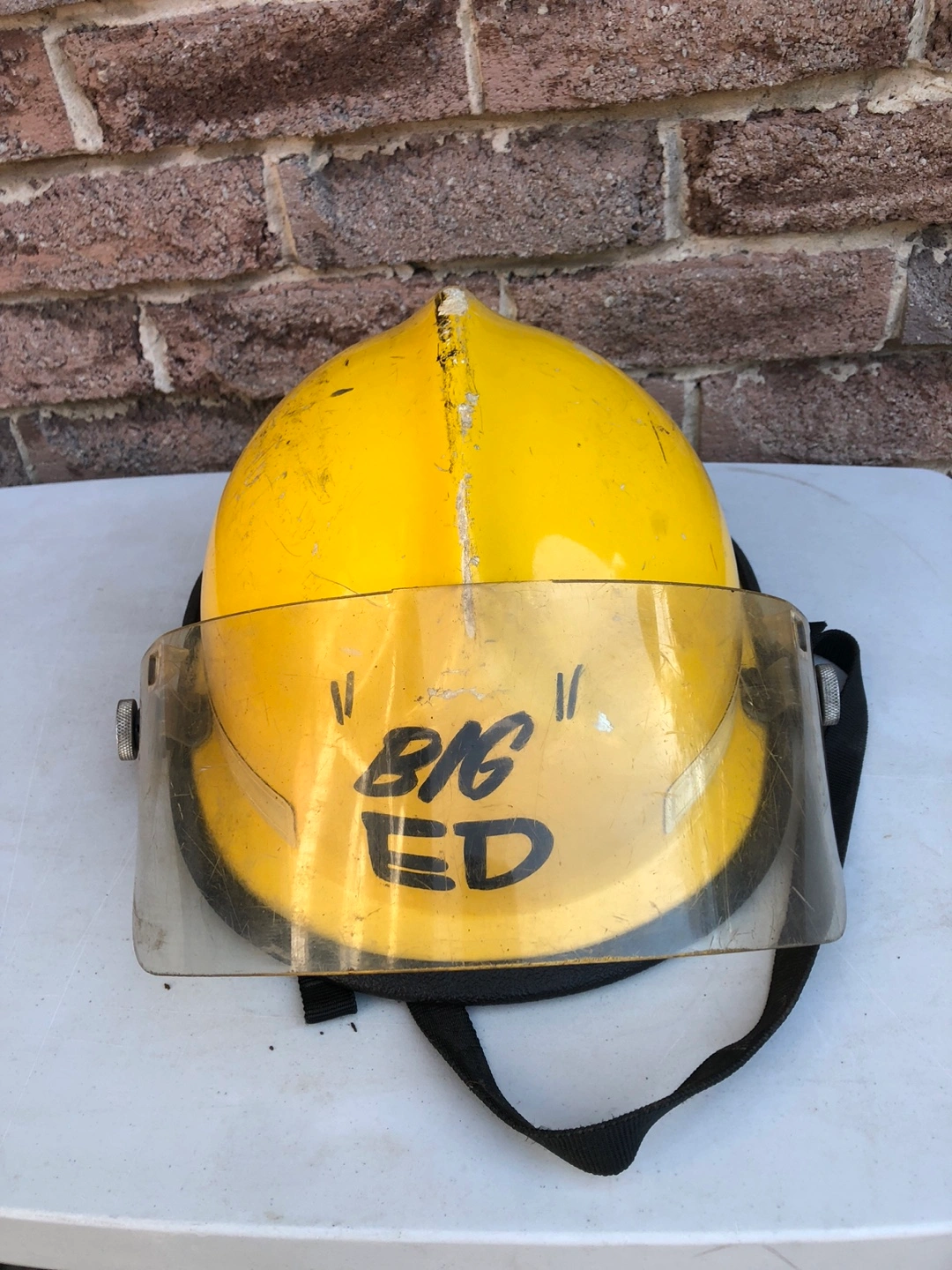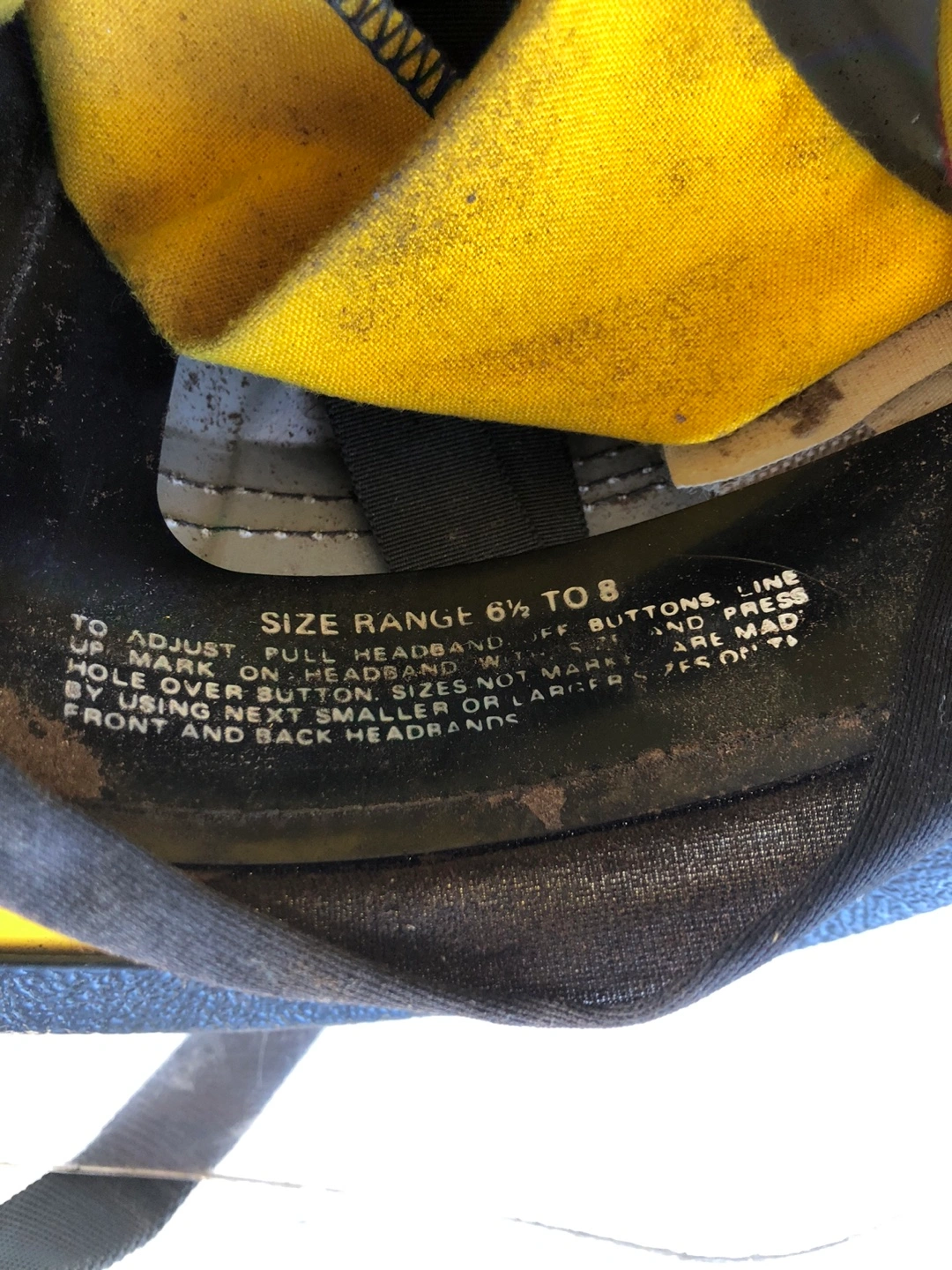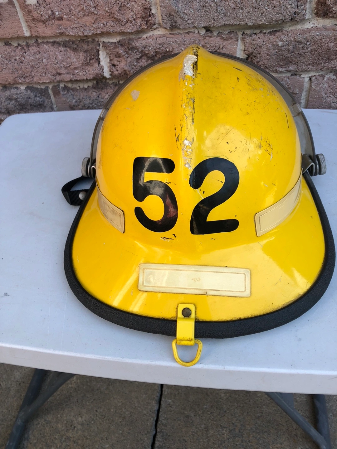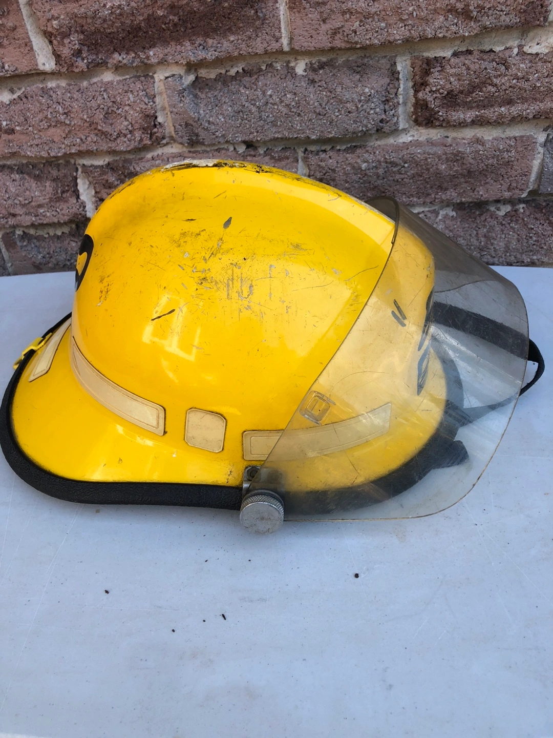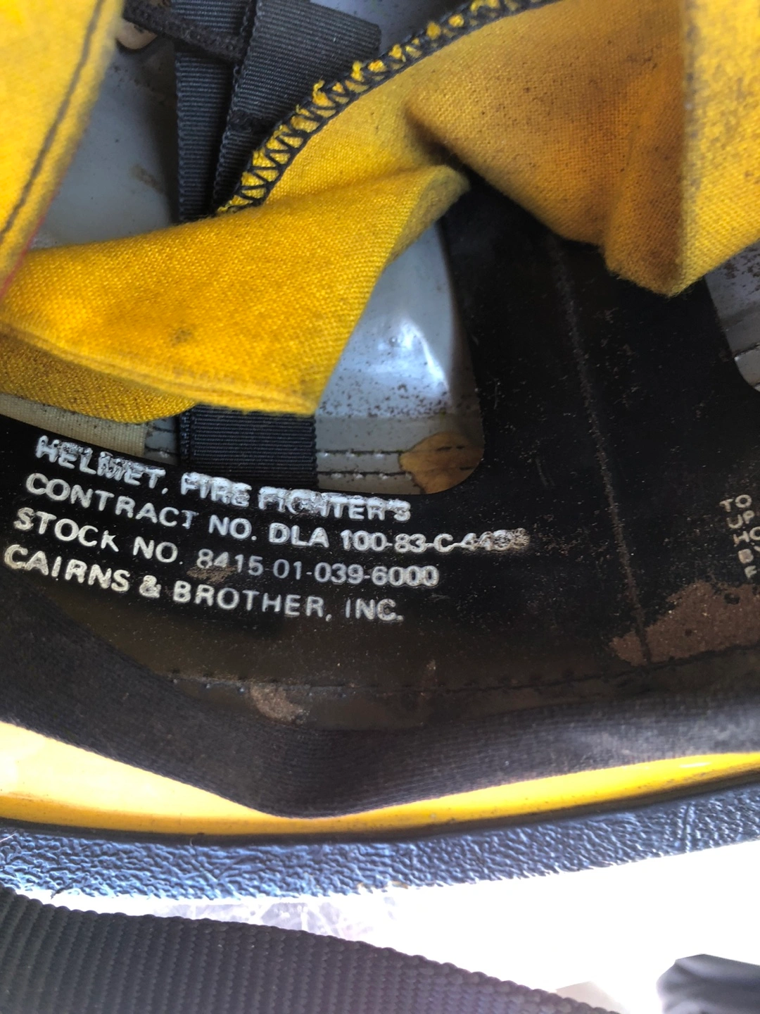 Selling a Cairns & Brother firefighter helmet. It's yellow and shows some signs of wear, but it's still in good working condition. The size range is 6 1/2 to 8.