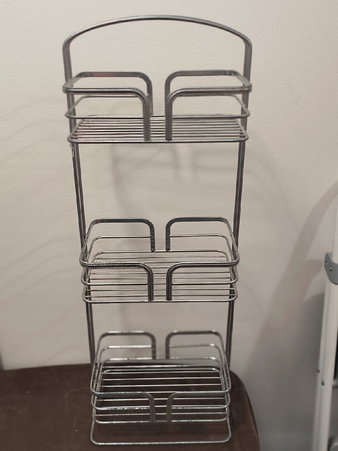 Selling a chrome bathroom shelf. It's in great condition and ready to organize your toiletries or towels! It has three tiers, offering plenty of storage space.