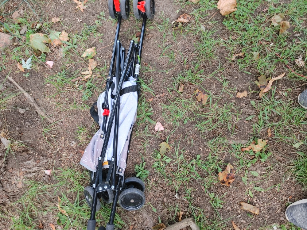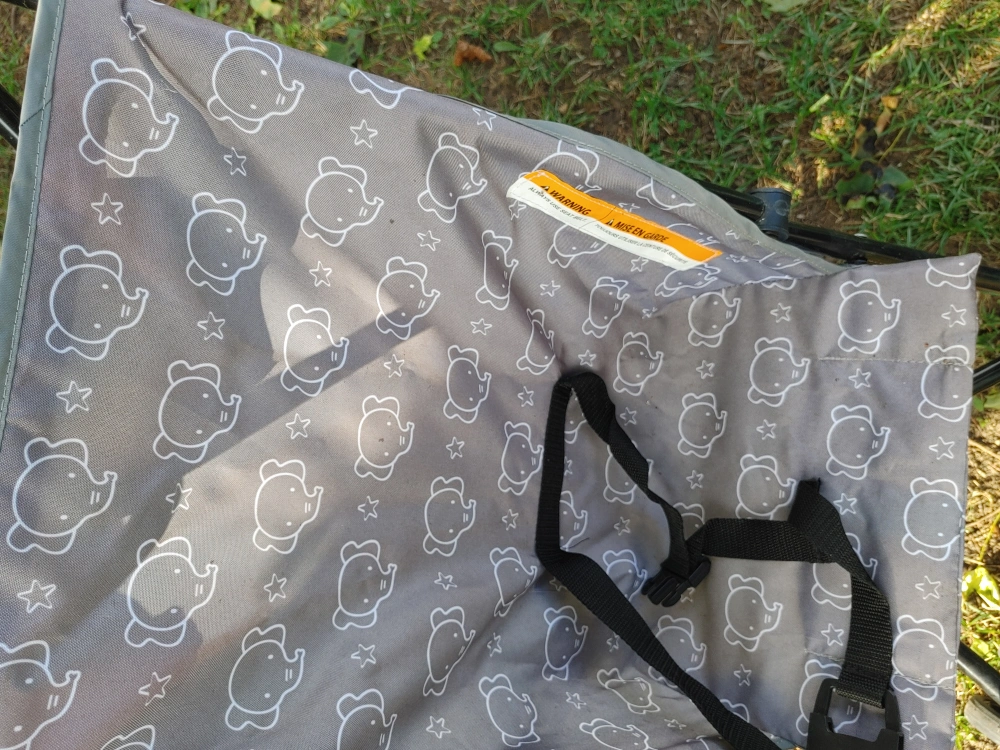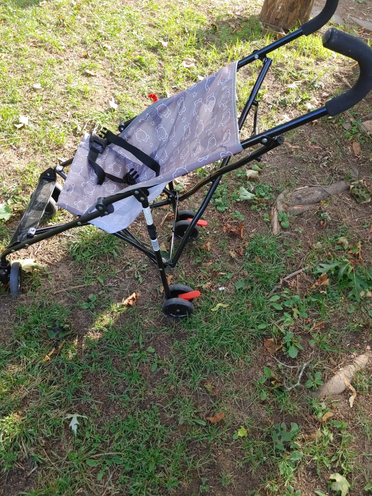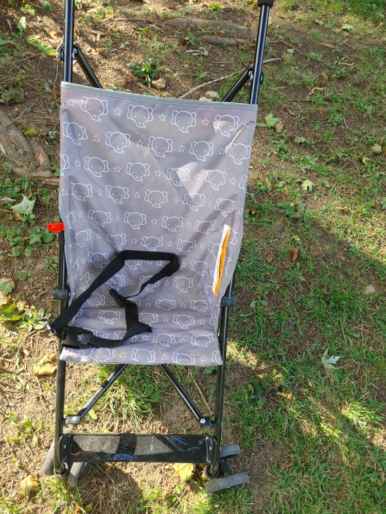 Here's a lightweight umbrella stroller, perfect for quick trips and travel! It features a cute grey fabric with an all-over elephant print. It's easy to fold and carry, making it super convenient for parents on the go