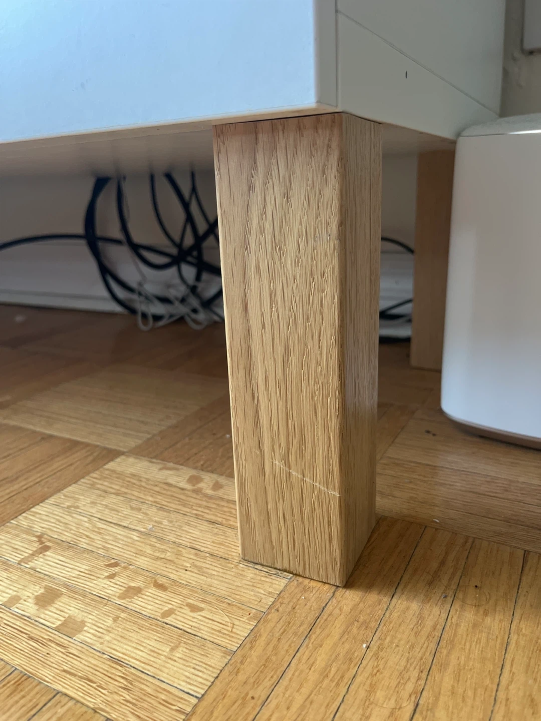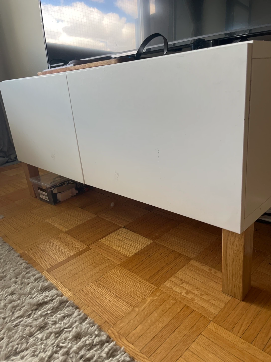 Selling a used IKEA TV stand in white. It's in good condition and perfect for any living room setup. The stand has two doors, providing ample storage space for your media devices and accessories. The legs are made of wood.