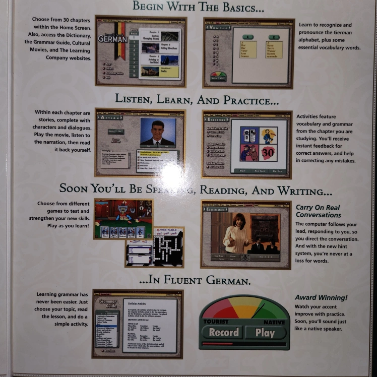 Learn To Speak German by The Learning Company! This is the complete interactive learning solution. The box includes a 3 CD set, and it's new version 7.0. Over 100 lessons covering pronunciation, vocabulary, grammar, speaking, listening, reading, writing, conversation, and reference. Plus, speech recognition, simulated conversations, practice games, cultural movies, audio tape microphone offer, and a workbook