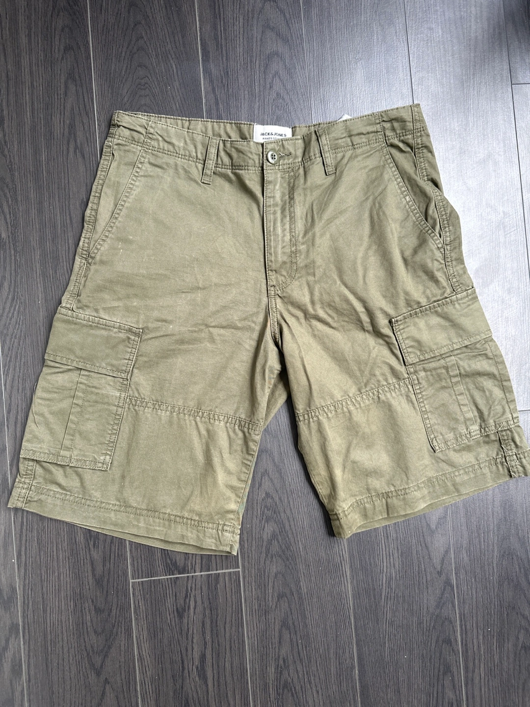 25Jack & Jones cargo shorts, olive green. They feature a cargo design with functional pockets.