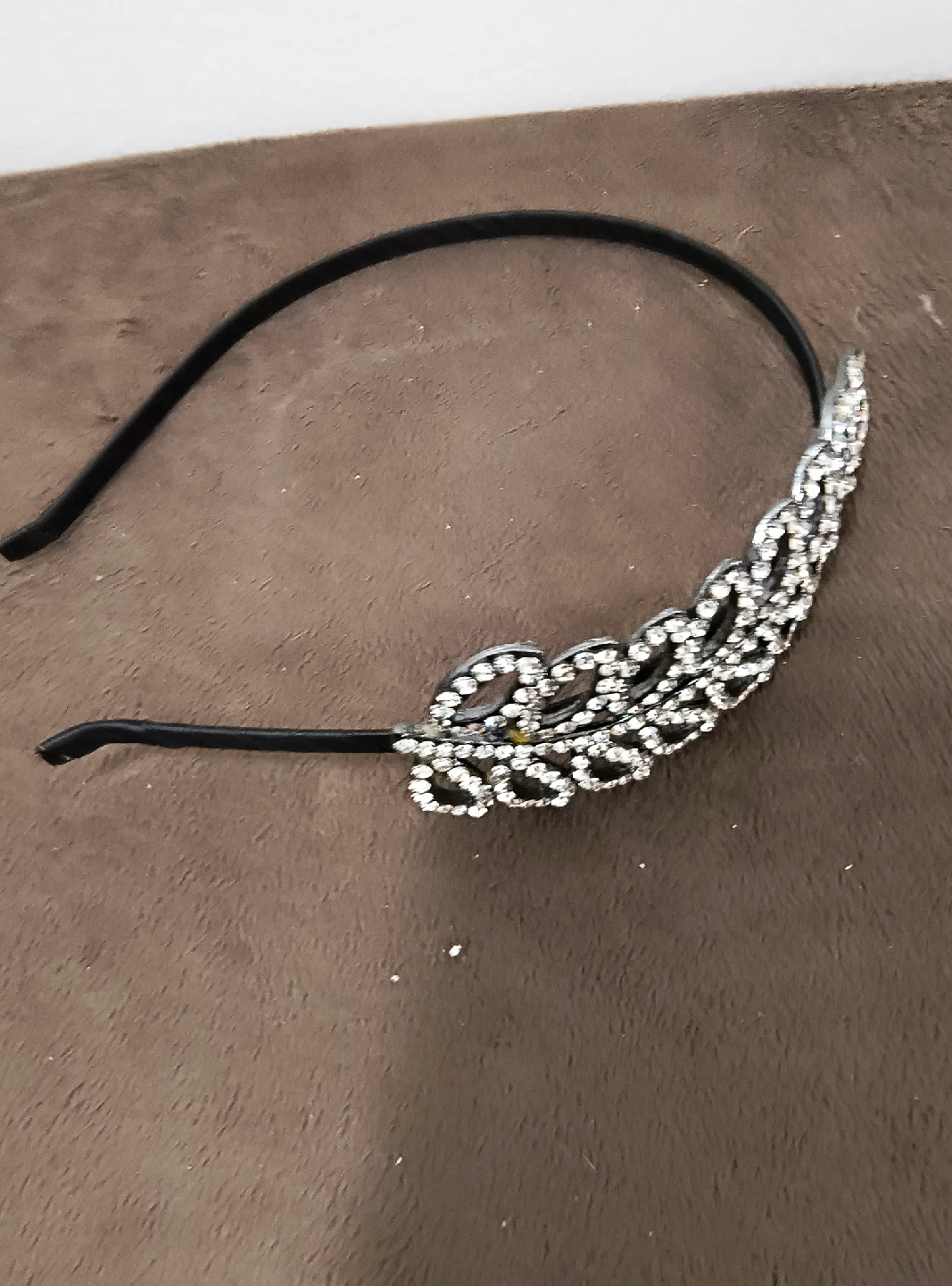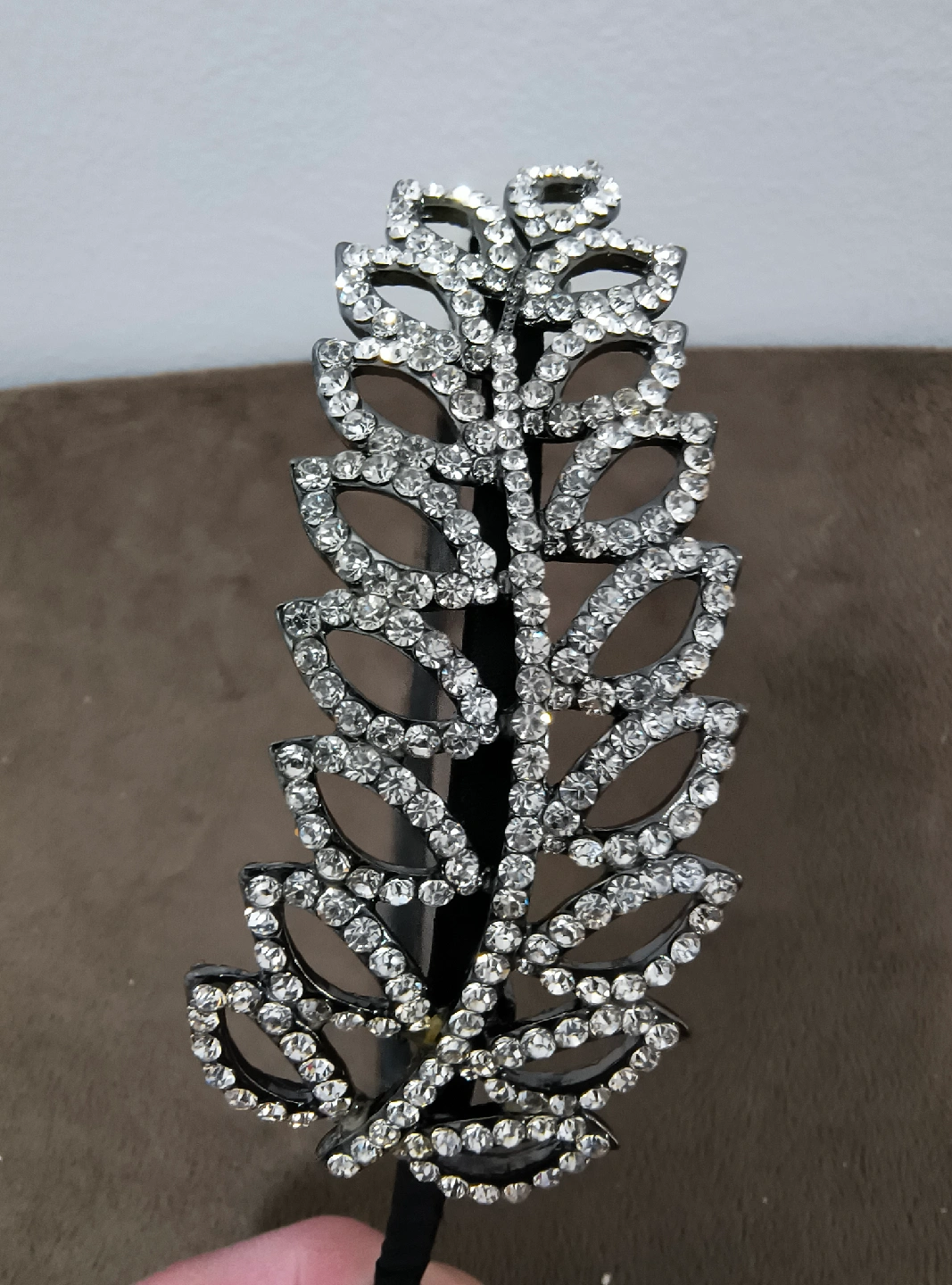 Sparkly rhinestone leaf headband. The headband itself is black. Great for adding a touch of glam to any outfit!