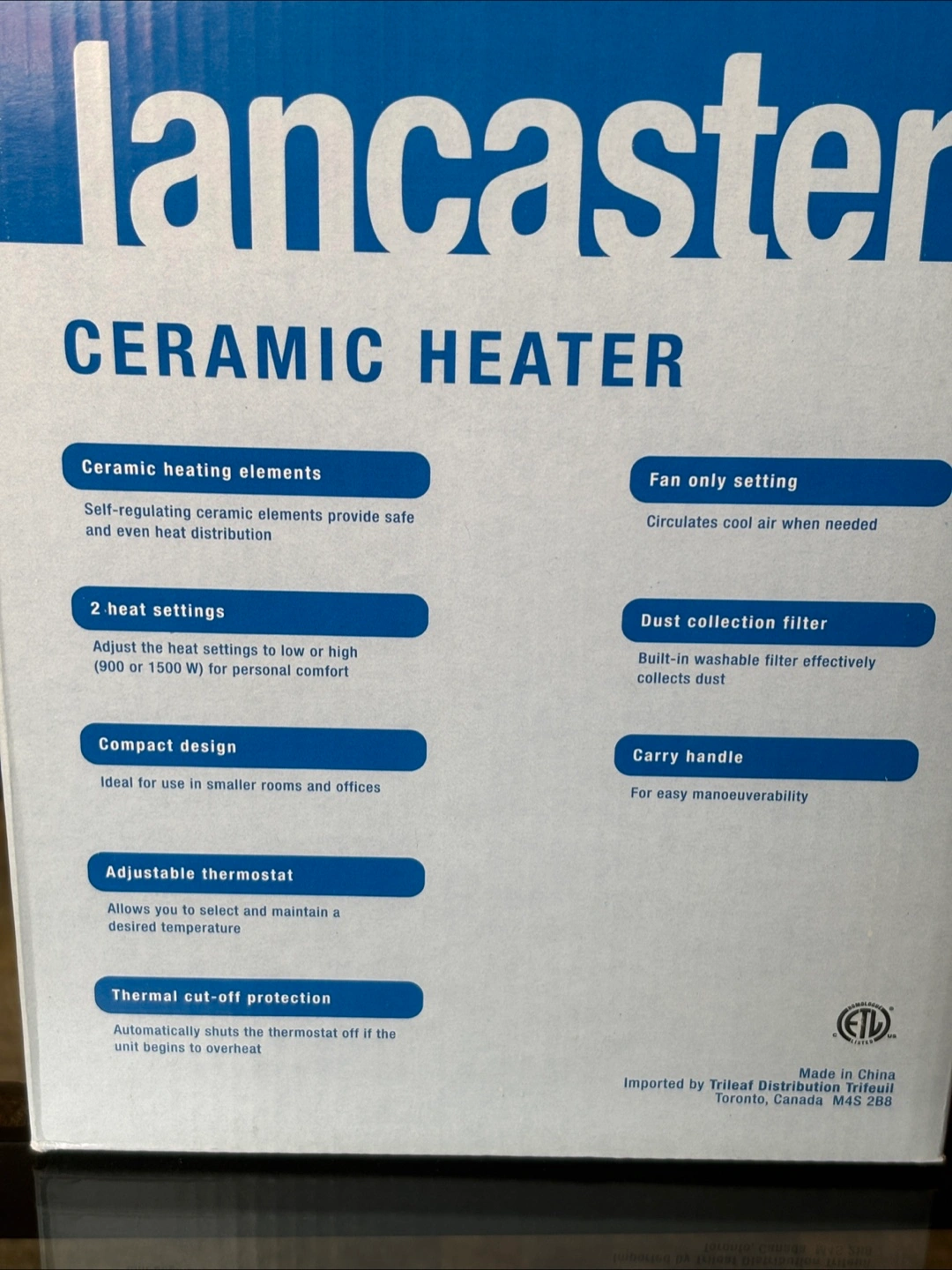 Selling a Lancaster ceramic heater that's in great condition! It comes with the original box. - Ceramic heating elements - 2 heat settings (900/1500 W) - Compact design, ideal for small spaces - Adjustable thermostat - Thermal cut-off protection for safety - Fan only setting: circulate cool air when needed - Dust collection filter: washable - Carry handle From a PF and SF home. Pickup only in the St Lawrence market area of downtown Toronto. Cash only. Firm.