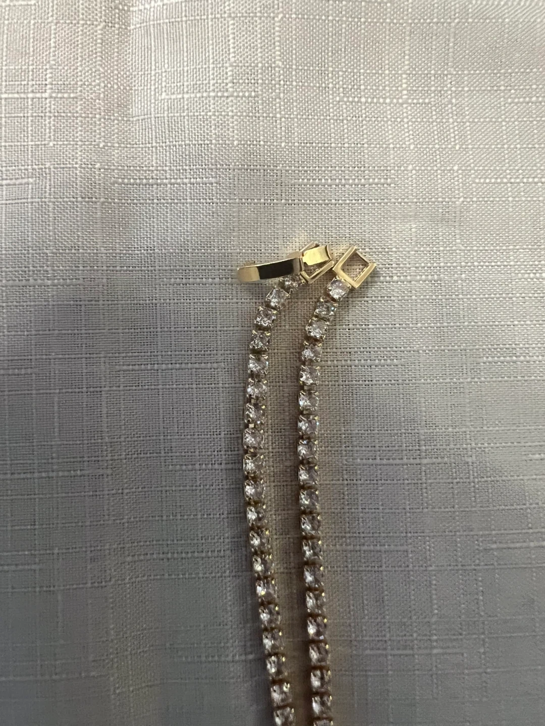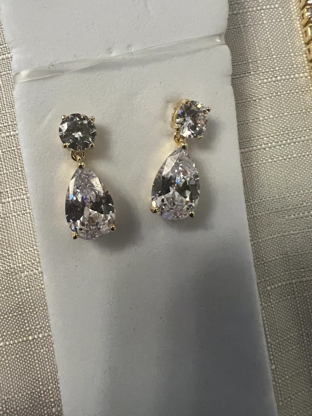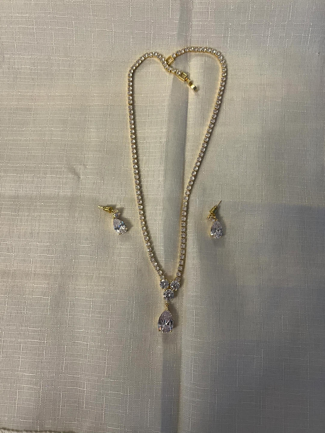 Beautiful gold tone necklace and earrings set with clear stones. Perfect for a special occasion! Its nice for sweet 15 or 16
