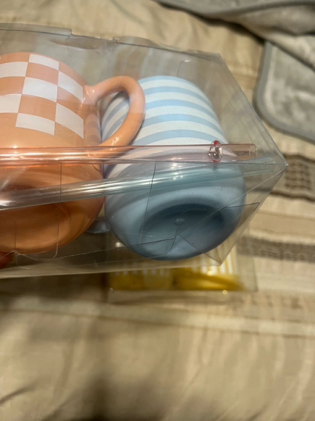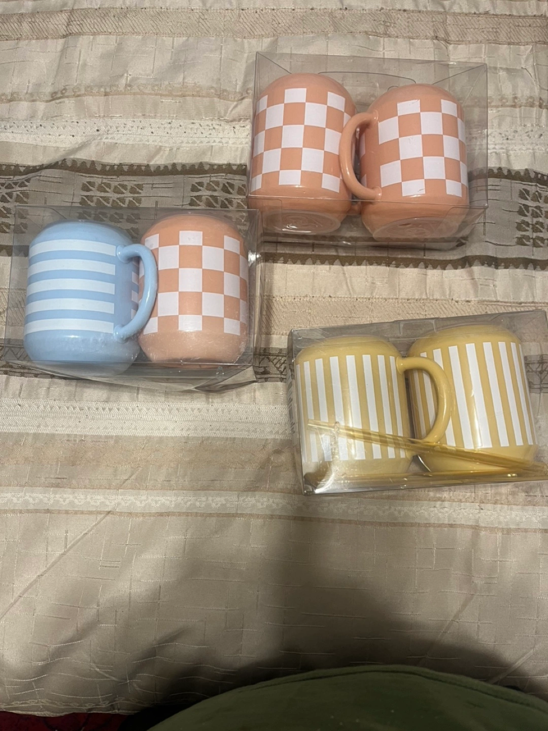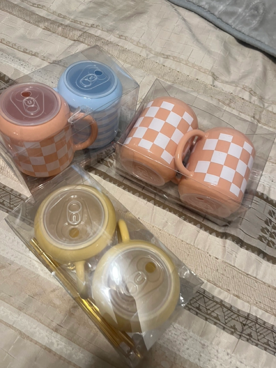 I have some adorable pastel mugs for sale! They come in sets of two and include matching straws. Perfect for adding a pop of colour to your kitchen or giving as a gift. They are brand new and still in their original packaging