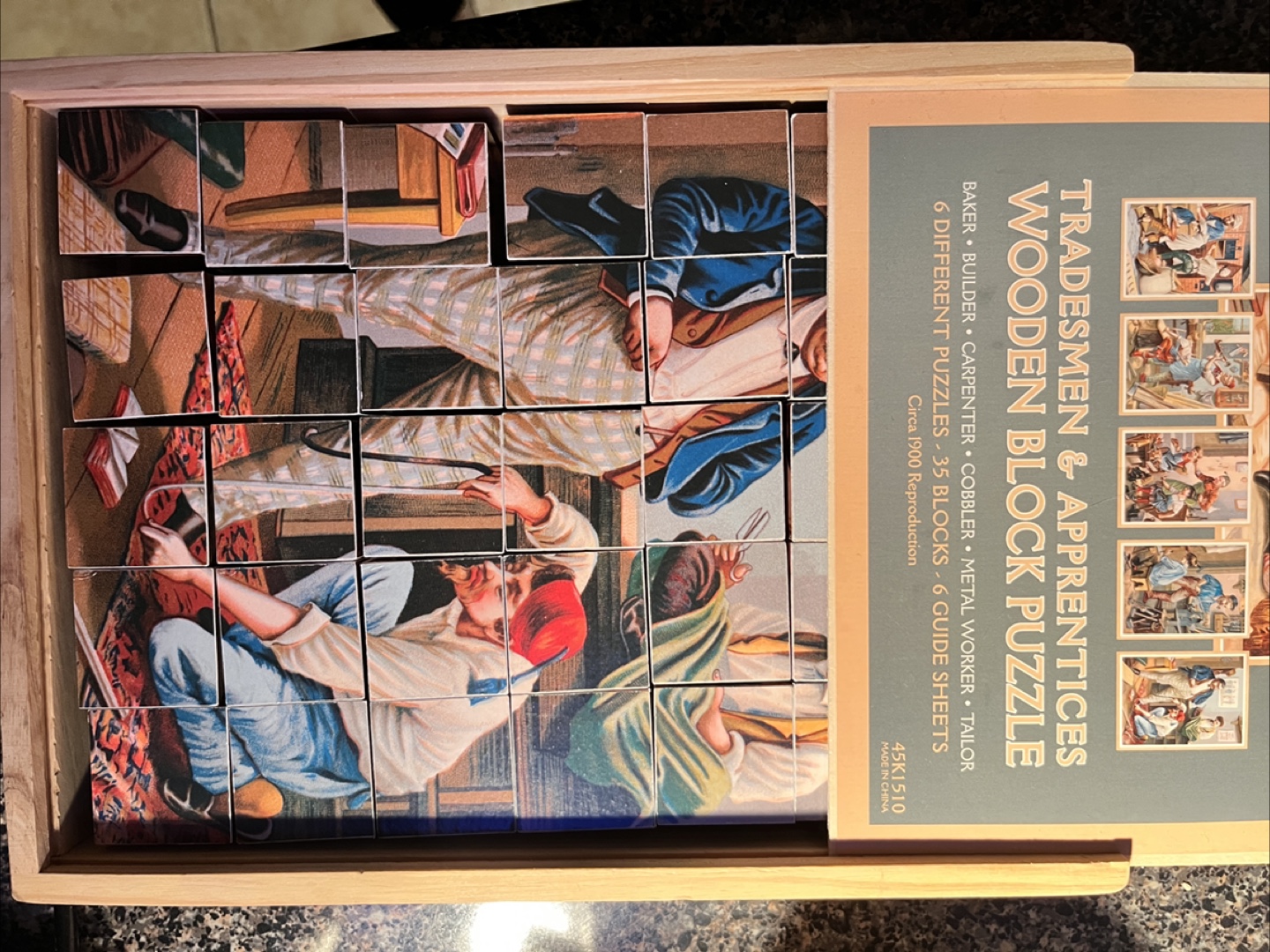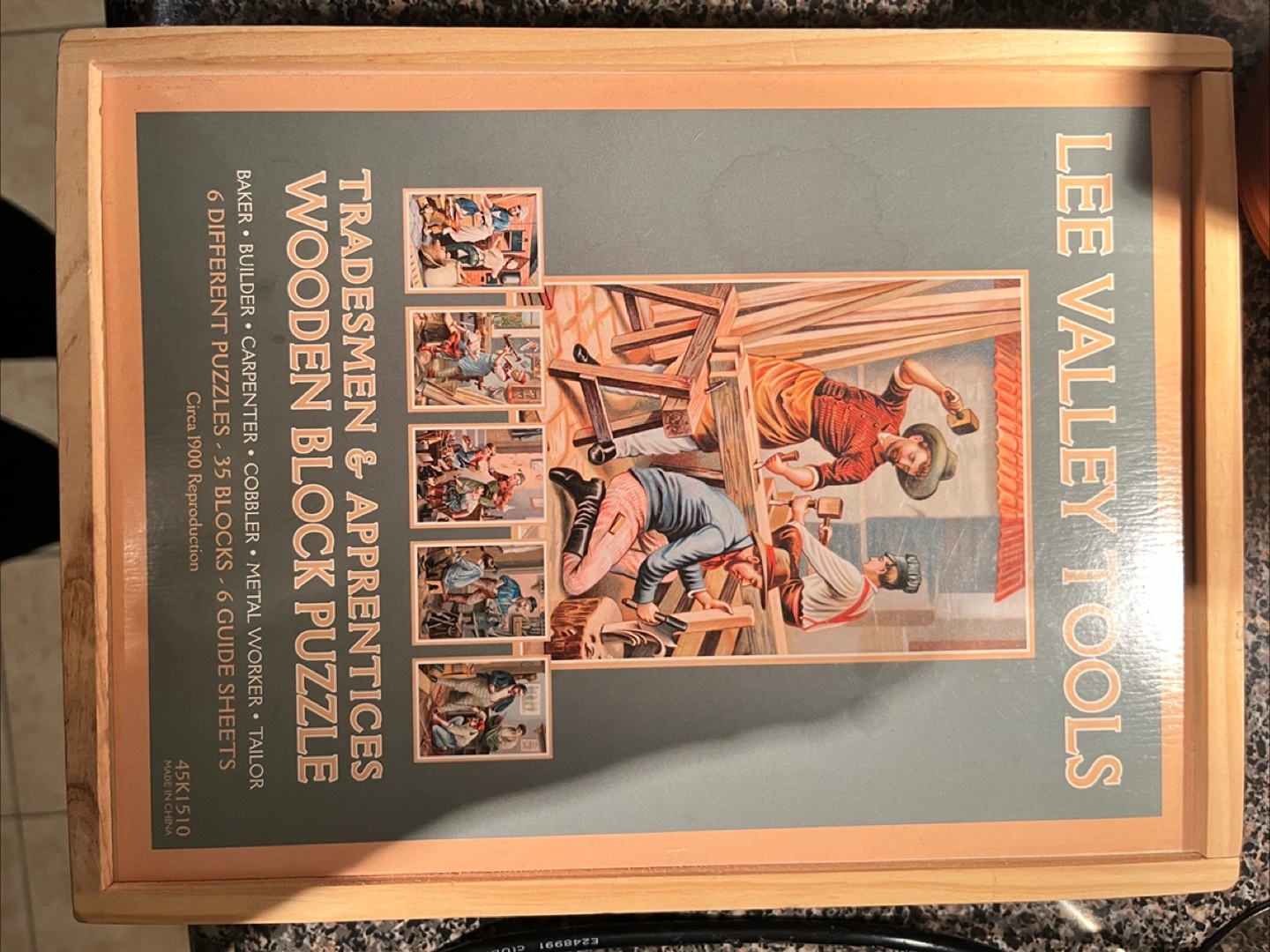 Selling a Lee Valley Tools Tradesmen & Apprentices Wooden Block Puzzle. It features 6 different puzzles with 35 blocks and 6 guide sheets. A circa 1900 reproduction.