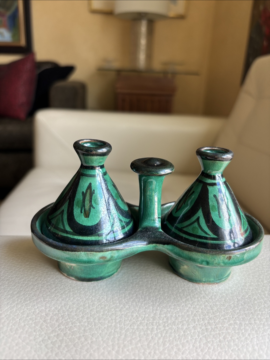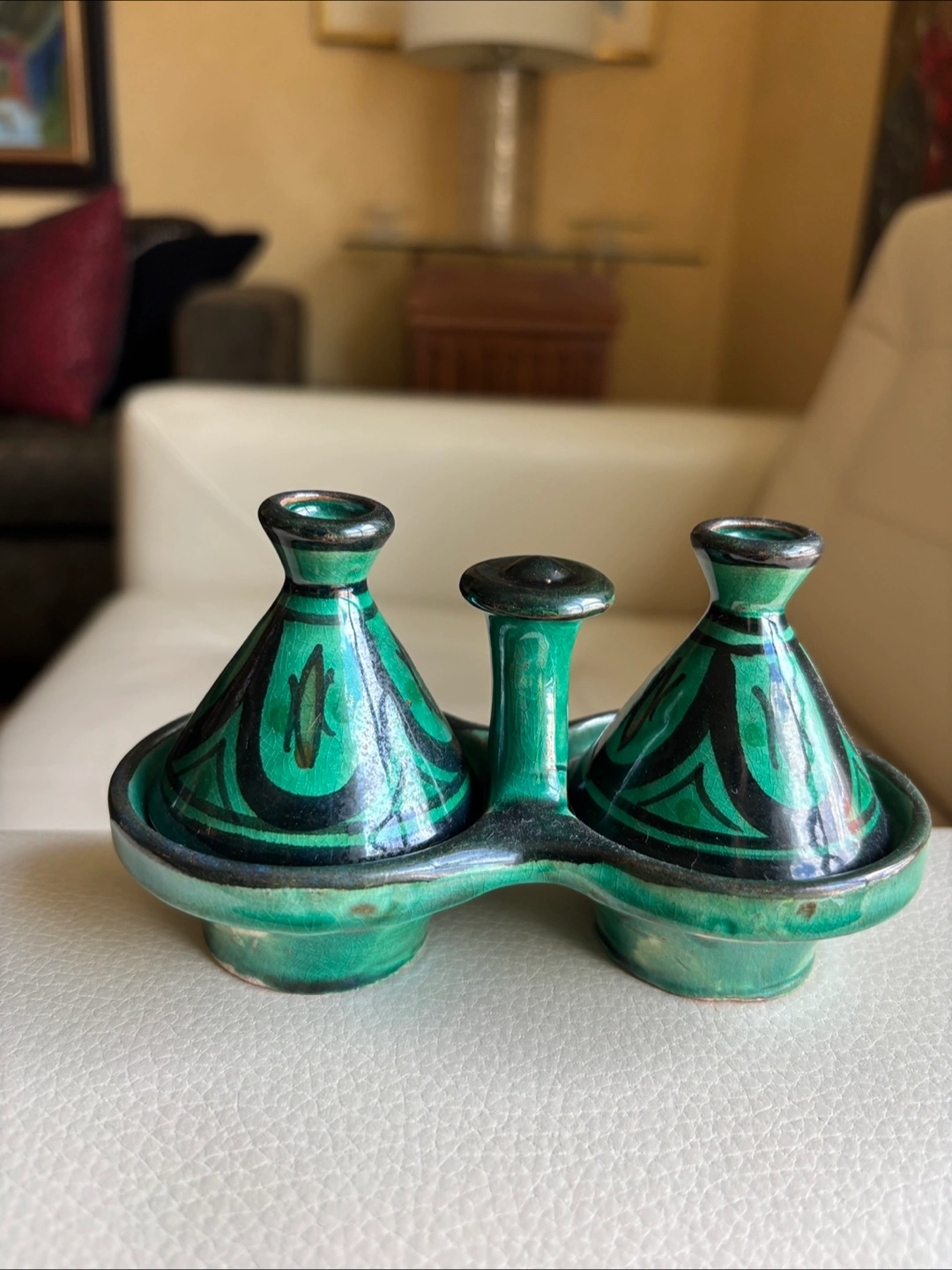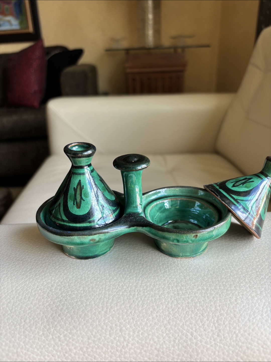 Selling a vintage Moroccan tagine spice set! It's a beautiful green colour with black detailing. This unique piece would be a lovely addition to any kitchen or dining room. Perfect for holding spices or small condiments, and adds a touch of North African flair to your home.